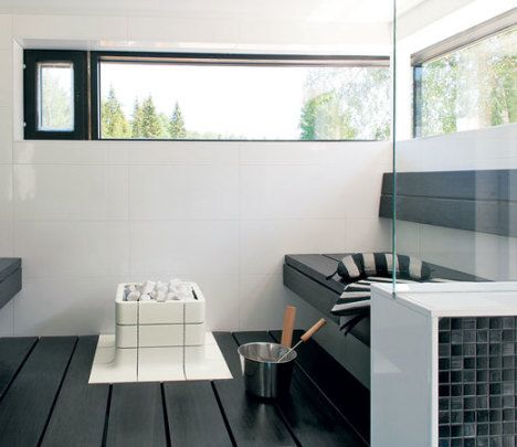 Mustavalkoisuus on eleettömän tyylikästä myös saunatiloissa. Seinät on kaakeloitu valkoisiksi ja lauteet petsattu mustiksi. Nuoska-kiuas valkoisilla kivillä on Tulikiven.