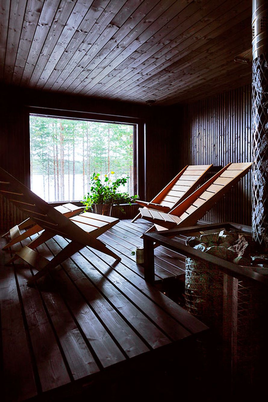 Eiväthän lauteet pakollisia ole. Voit myös saunoa puutarhatuoleja muistuttavissa nojatuoleissa! Tämä sauna on juontaja Saimi Hoyerin vapaa-ajankodissa. Kuva: Tuomas Kolehmainen.