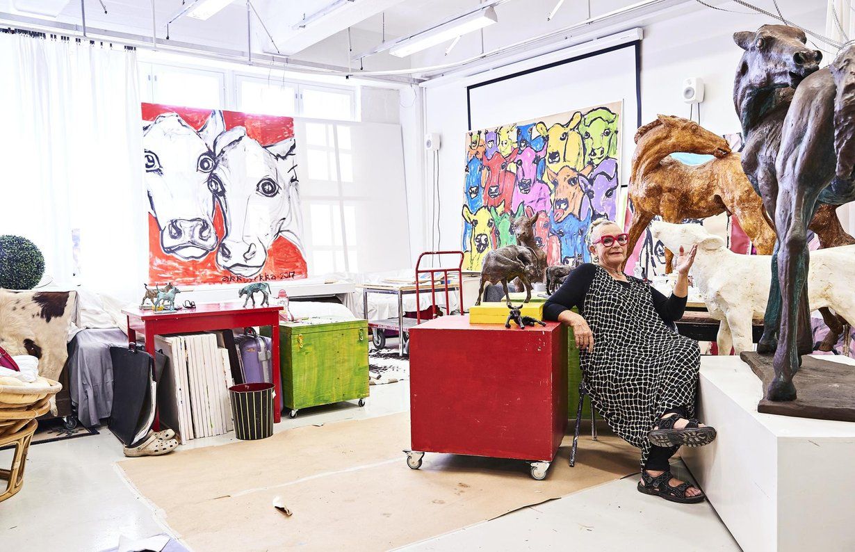 Tällä hetkellä Miinan työhuone Kaapelitehtaalla on lähinnä varastotila, joka on täynnä valtavia lehmämaalauksia ja kaikenkokoisia veistoksia pikkuruisista vasikoista jättimäisiin varsoihin. Monet työt syntyvät metallipajalla – tai siellä, missä inspiraatio iskee.