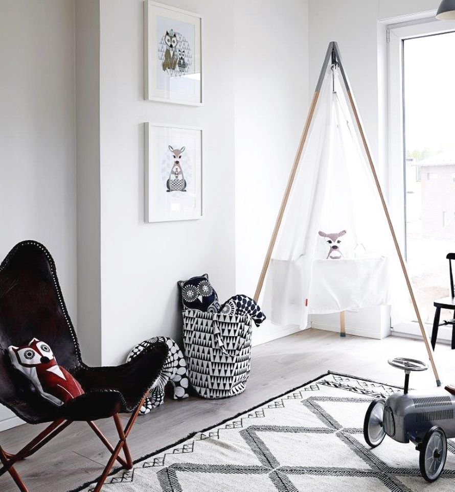 1. MUSTAVALKOISTA VAAVILLE. Jos kodin tyyli on mustavalkoinen ja pelkistetty, sama tyyli toimii lastenhuoneessakin. Hauskat tekstiilit ja eläinhahmot tekevät huoneen ilmeestä iloisen. Paimentolaistyyppinen matto sopii myös vaavin kamariin. Kohde Kristallikuutio 20 A. Kuva Krista Keltanen.