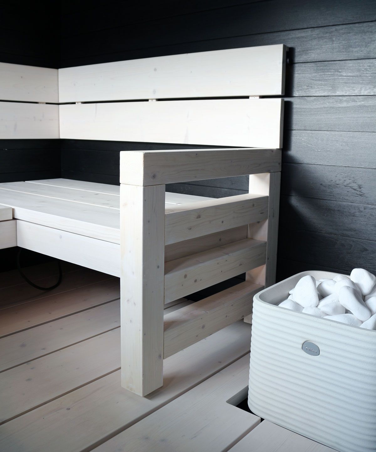 5. JOTAIN ERILAISTA SAUNAANKIN. Ensin tulivat muotiin valkoiset saunat, sitten mustat... ja nyt näemmä mustavalkoiset. Ja mikäpä ettei, vaikutelma on varsin raikas, kun mustaksi petsatun saunan virkistävät vaaleat, suoralinjaiset lauteet ja kaunis valkoinen kiuas. Villa Beauty, kohde numero 17.