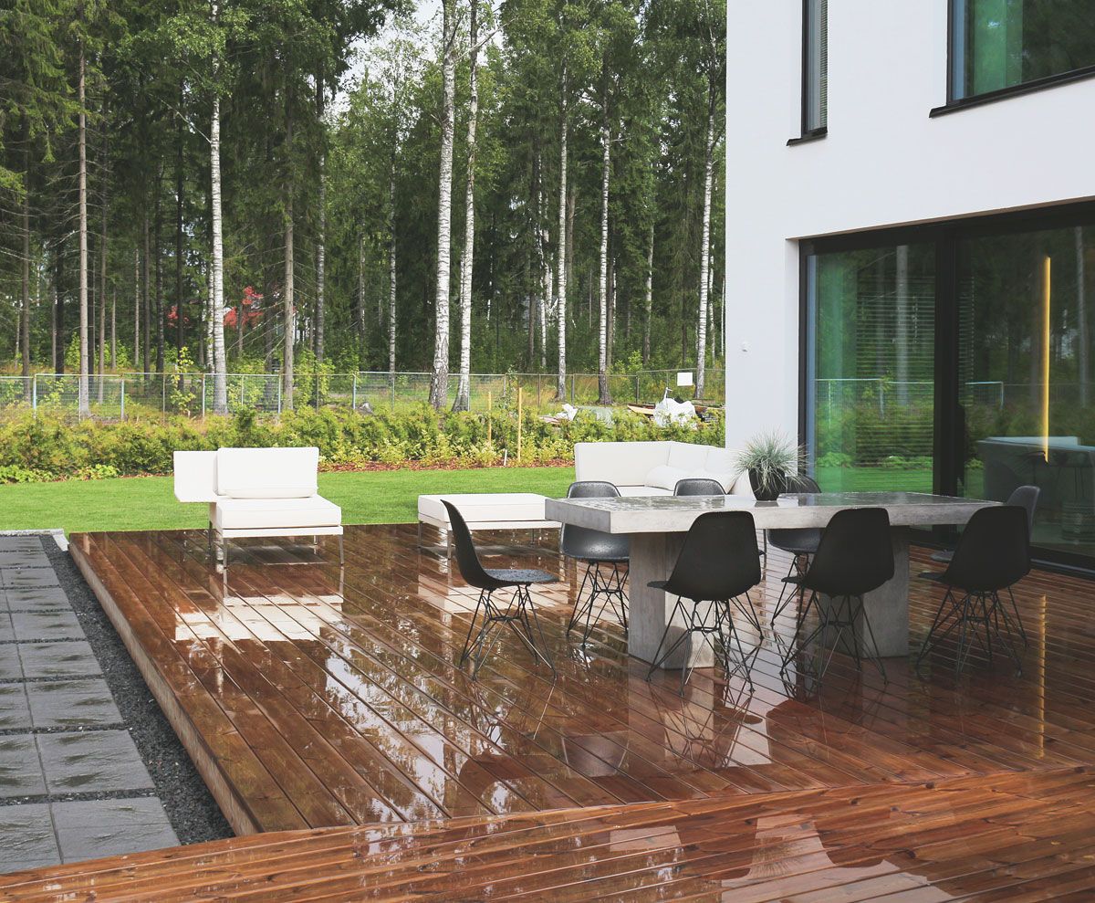 9. ISO TERASSI TOIMII. Iso terassi lisää pihan tilantuntua. Kun  terassilla on reilusti kokoa, on sisustajalla mahdollisuus jakaa se erilaisiksi oleskelu- ja ruokailutiloiksi. Tässä avarassa terassissa ja sen linjakkaissa kalusteissa on italialaista tyylikkyyttä. Lakkalaine, kohde numero 22.