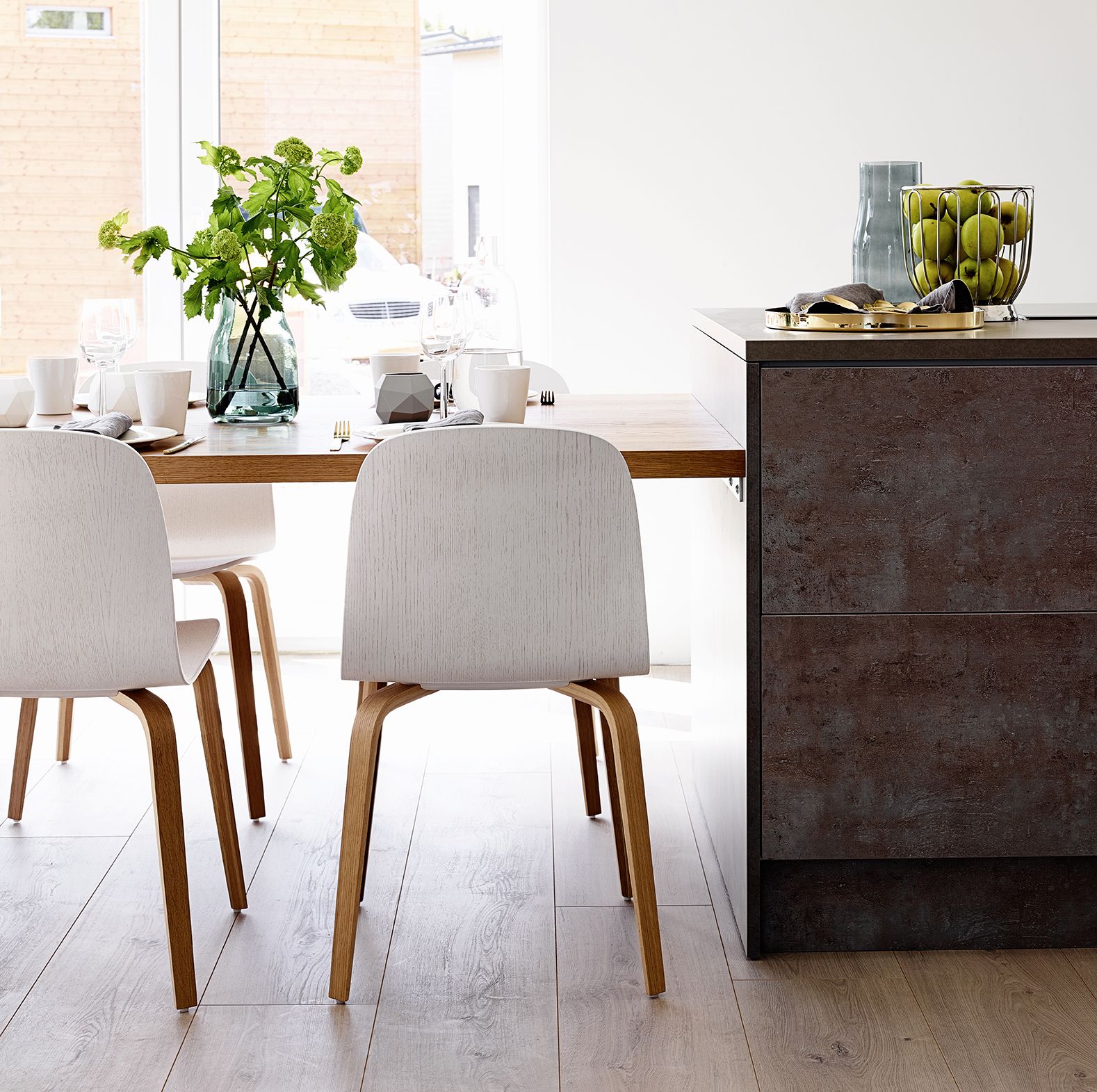 2. RUOKAPÖYTÄ JATKAA SAAREKETTA. Tässä tilassa ruuanvalmistus, syöminen ja seurustelu yhdistyvät toimintoina saumattomasta toisiinsa. Yhtenäisyyden tuntua lisää ratkaisu kiinnittää ruokapöytä kiinni saarekkeeseen. Ruokapöytä on teetetty puusepällä. Kohde Kristallikuutio 20 A. Kuva Krista Keltanen.