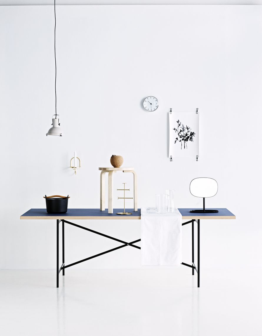 Corbusierin suunnittelema Projecteur-lamppu 221 e, Formverk, Timo Sarpanevan valurautapata 219 e, Iittala, Hayn Lup-kynttilänpidike 43 e, Armas, Alvar Aallon kolmijakkara 185 e, Artek, Hemin Pom-korkkiomena 46 e ja RK Designin Shadows of Flowers -juliste 46 e, Finnish Design Shop, metallikilpsit 4,90 e / 5 kpl, Granit. Menun koruteline 113 e, Armas, Klassikko-pöytäliina 53,90 e, Finlayson, Anu Penttisen suunnittelema Vitriini-lasirasia 52,90 e, ja Kaj Franckin Kartio-kaadin 54,50 e, IIttala. Bodumin mitta-astia käy hyvin myös maljakoksi, 21,90 e, Stockmann. Normann Copenhagenin Flip-peili, 95 e, Formverk ja Richard Lampertin Eiermann 2 -pöytä sinisellä linoleumipinnalla 886 e, Finnish Design Shop.