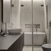 -Tilan mittasuhteet olivat erikoiset. Näytti siltä, että suihkutilassa oli yhtä paljon tilaa kuin uimahallissa. Ikkunajako ja kantavat seinät kuitenkin rajoittivat seinien siirtelyä, ja teinkin tilan pohjaratkaisuista useamman version, sisustussuunnittelusta vastannut Anna-Kaisa Melvas kertoo.