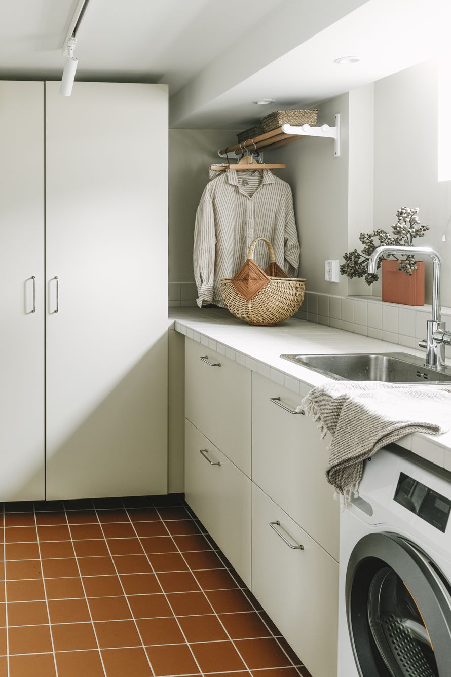 -Myös seinissä ja tasoissa laatta ja sävy ovat samat. Kodinhoitotilojen tasot on laatoitettu. Kodinhoitohuoneen kaapinovet ovat Ikeasta, mutta ne maalautettiin tason ja seinän laatan sävyisiksi, Melvas kertoo.