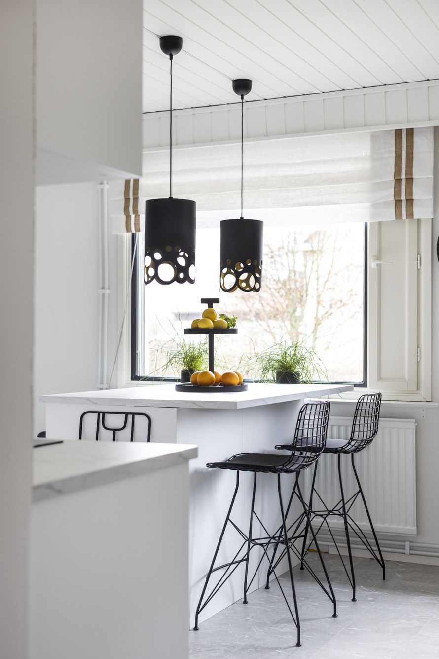 Nina ja Tommi löysivät mieluisan keittiön Ikeasta. Särmää vaaleiden kaapistojen rinnalle tuo musta vitriinikaappi. Saarekkeen yllä olevat valaisimet ovat K-Rauta Otrasta ja kepeät baarijakkarat löytö tori.fi:stä.