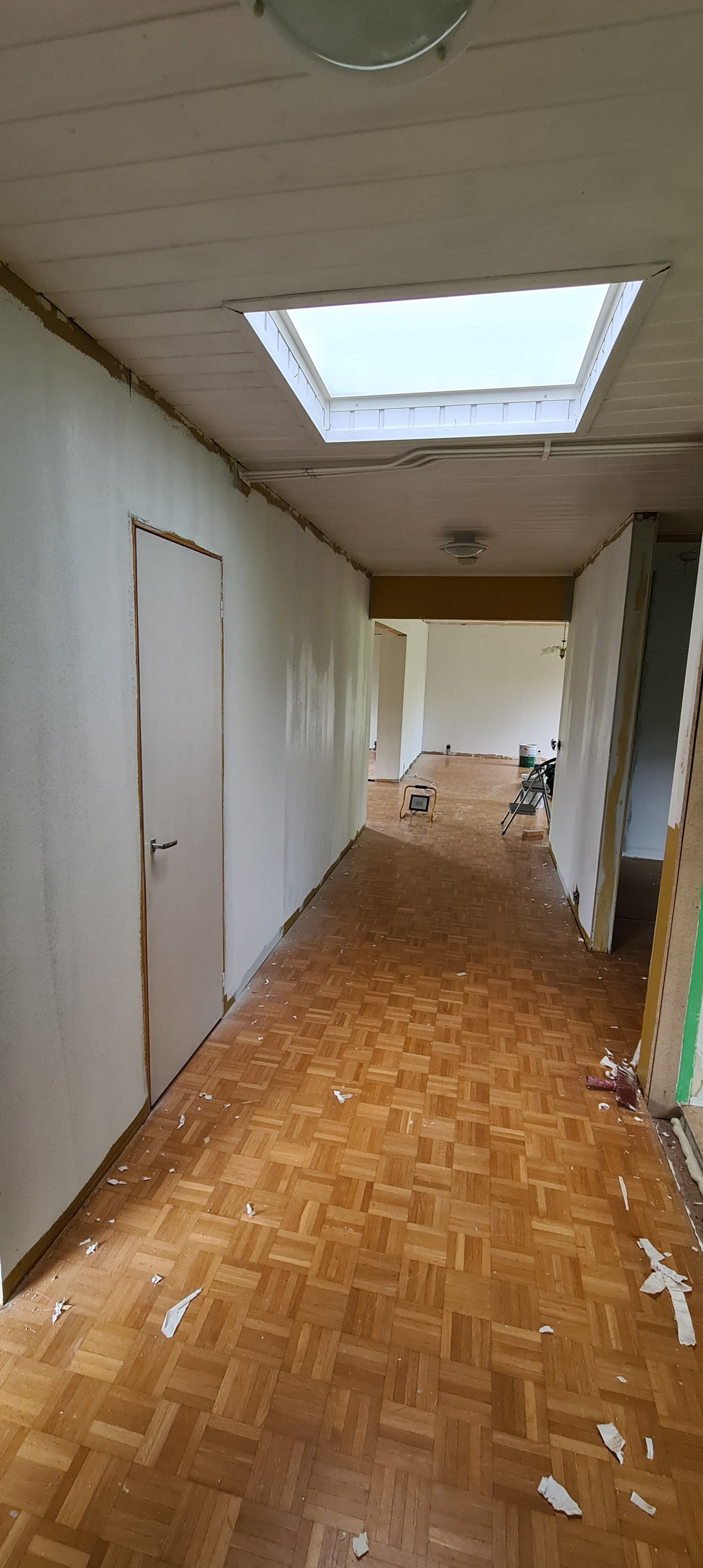 Pariskunnan toiveena oli muokata talo melko pienellä budjetilla heidän tarpeitaan vastaavaksi. Remontilla haluttiin raikastaa talon ilmettä ja korostaa sen parhaita puolia, kuten valoisuutta. Sisäpuolen puupaneelit ja muut pinnat olivat päässeet vuosikymmenien aikana kellastumaan, joten kaikki seinät sekä katto saivat uuden maalipinnan. Muutamia seiniä purettiin, oviaukkojen kohtia vaihdettiin, ja lattiat saivat ylleen raikkaan ja yhtenäisen laminaatin, jonka kuviointi muistuttaa luonnonkiveä.