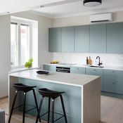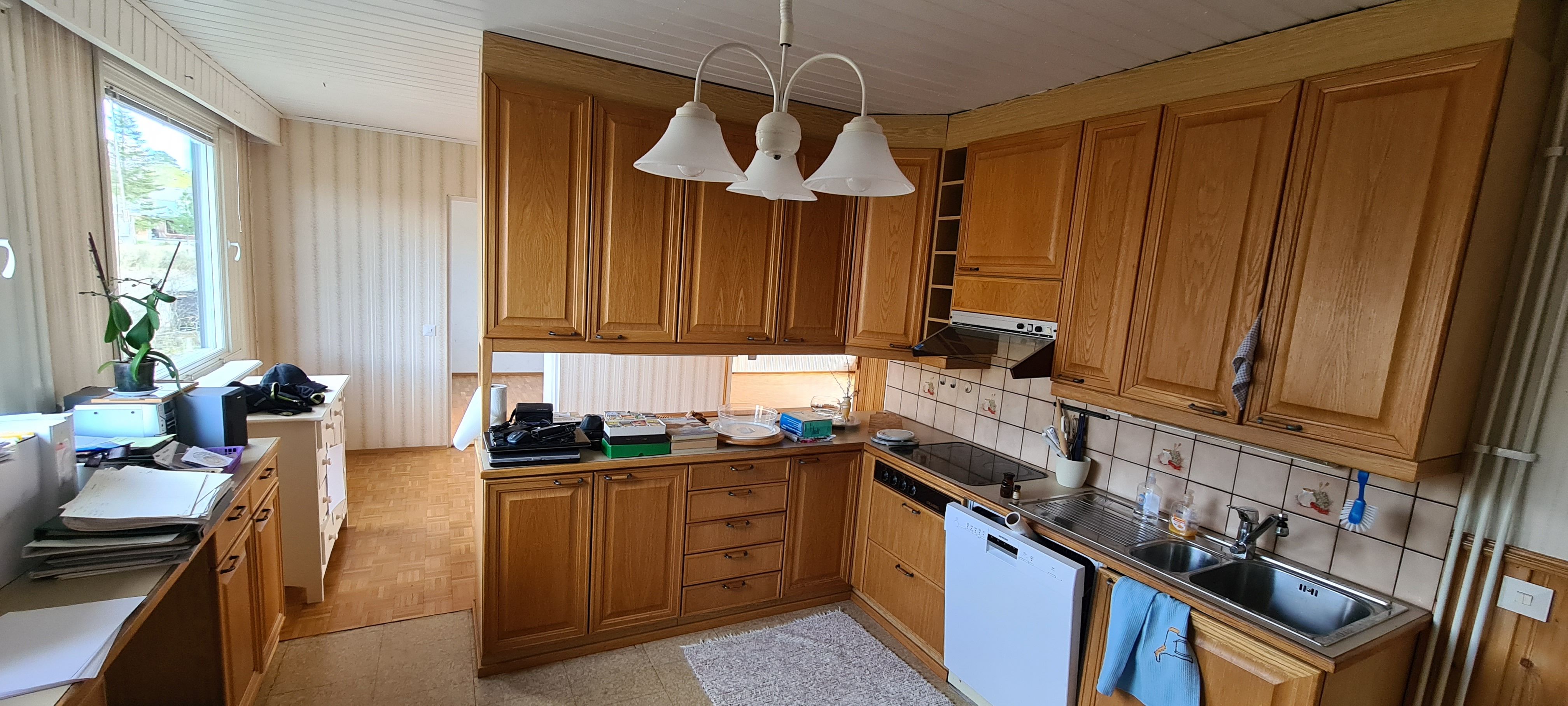 Suuren muutoksen koki myös keittiö, joka oli asukkaiden tarpeisiin hankalan mallinen. Puun väriset kaapistot henkivät mennyttä aikaa. Koska keittiöön haluttiin myös lisää laskutilaa sekä korkea jääkaappi ja pakastin, päätettiin vanha keittiö kodinkoneineen purkaa kokonaan pois.