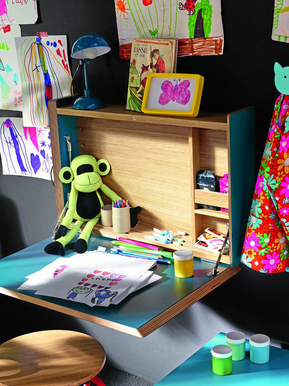 Kuva: HabitatPieneen lastenhuoneeseen sopii seinälle kiinnitettävä, taittuva työpöytä. Kun läksyt on tehty, voi pöytälevyn taittaa ylös, ja koululaiselle jää tilaa leikeille.