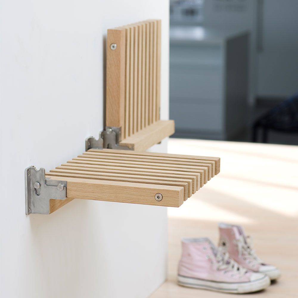Seinää vasten taittuva penkki vie tilaa vain ollessaan käytössä. Ratkaisu sopii esimerkiksi minikokoiseen eteiseen, johon ei mahdu tuolia. Taittopenkilläkin kenkien laitto jalkaan sujuu. Skagerakin Cutter-penkki 249 e, Royaldesign.