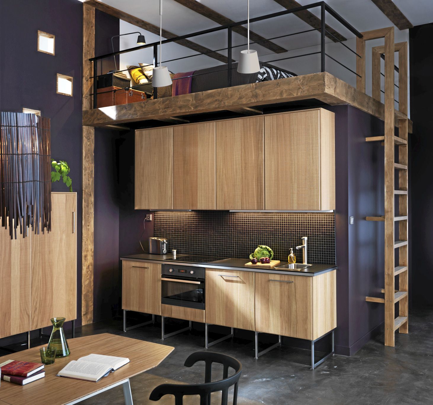 Kuva: IkeaMiniasuntoon voi rakentaa keittön yläpuolelle matalan makuuparven, jos vain huonekorkeutta riittää. Kevyet kaiteet pitävät tilan ilmavana. Tehokas ratkaisu on myös valita pystysuorat tikapuut loivien portaiden sijaan, jolloin portaisiin ei kulu lattiapinta-alaa.