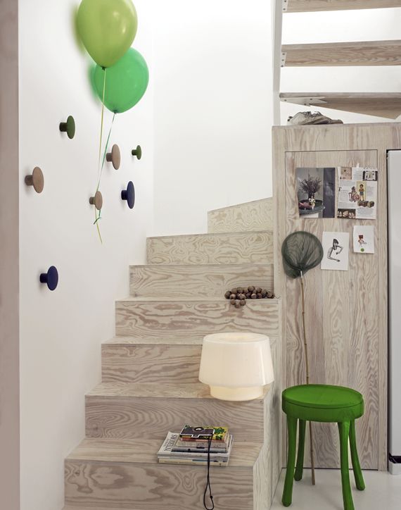 Hyödynnä portaiden alle jäävä kolo rakentamalla sinne varastokomero. Portaikon seinätilankin voi hyödyntää naulakoilla. Kokoelma Muuton Dots-ripustimia on tyhjilläänkin kaunis sisustuselementti, 17,90 e/kpl, Finnish Design Shop.