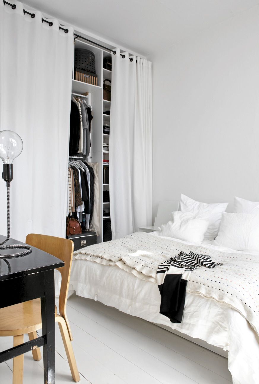 Kuva: Piia ArnouldVerhot ovat toimiva ratkaisu ahtaisissa tiloissa, joissa saranalliset ovet eivät mahtuisi aukeamaan. Tässä makuuhuoneessa sänky on niin lähellä vaatekaappia, että jopa liukuovien käyttäminen olisi vaikeaa. Verhot peittävät vaatteet, ja samalla ne pehmentävät huoneen tunnelmaa.