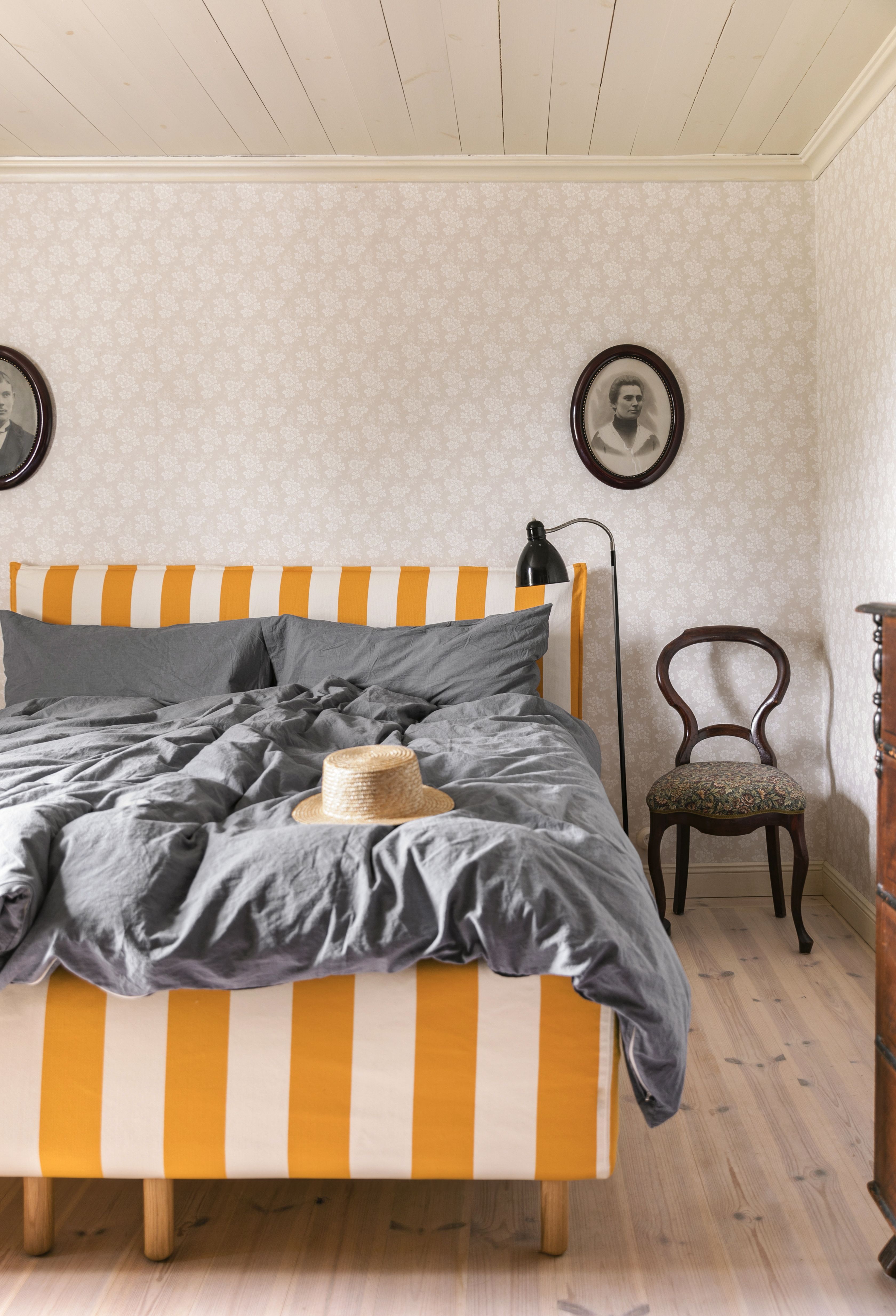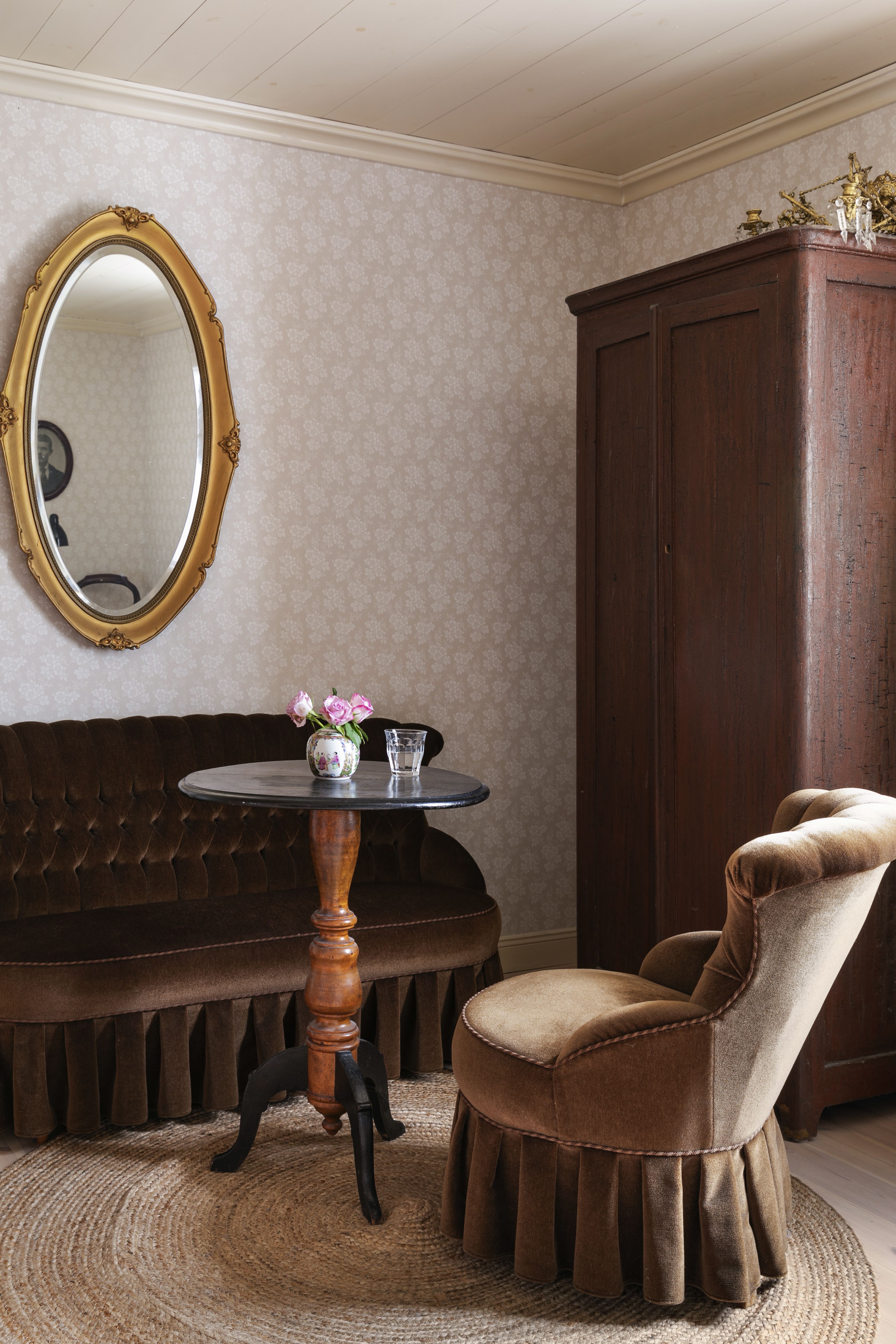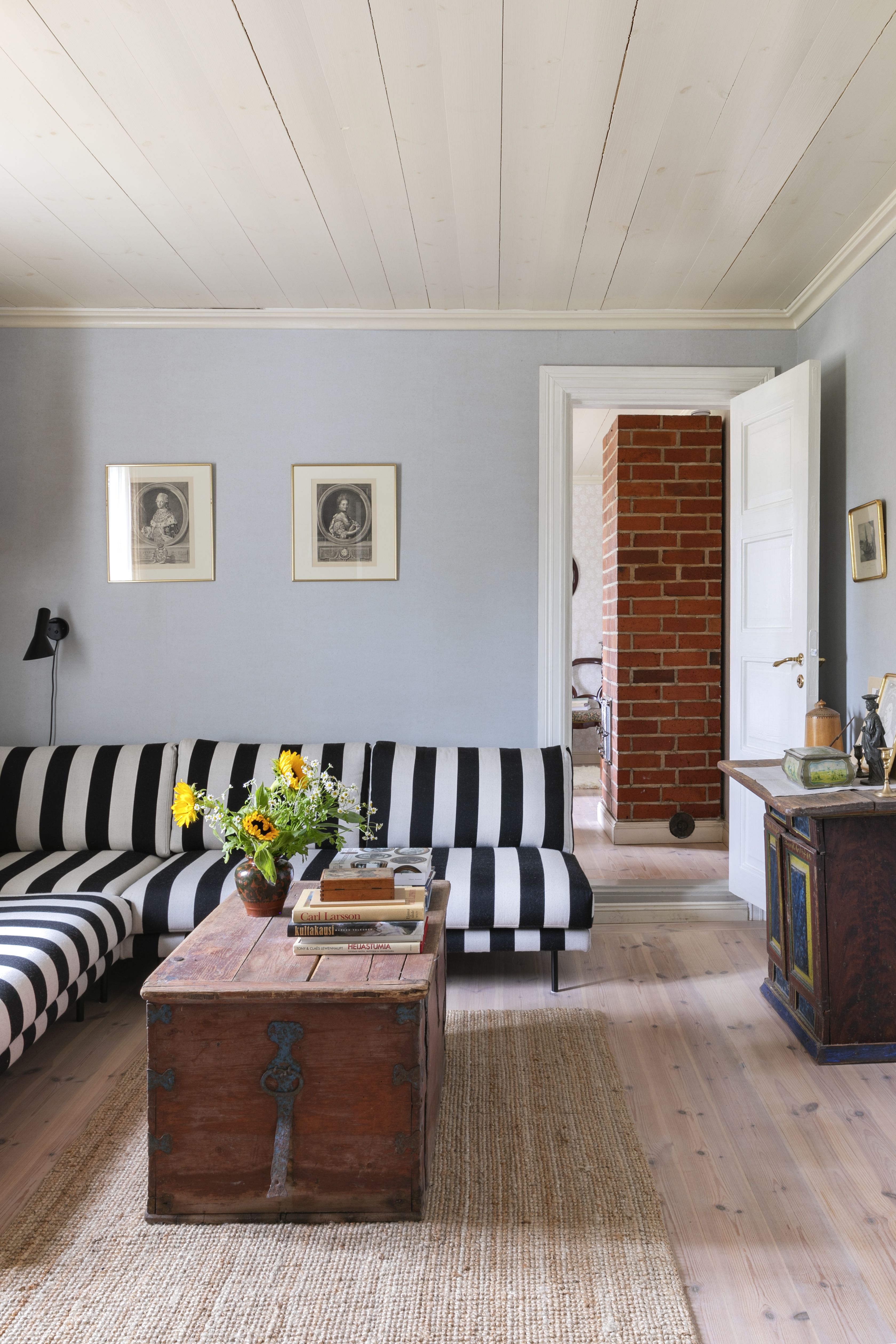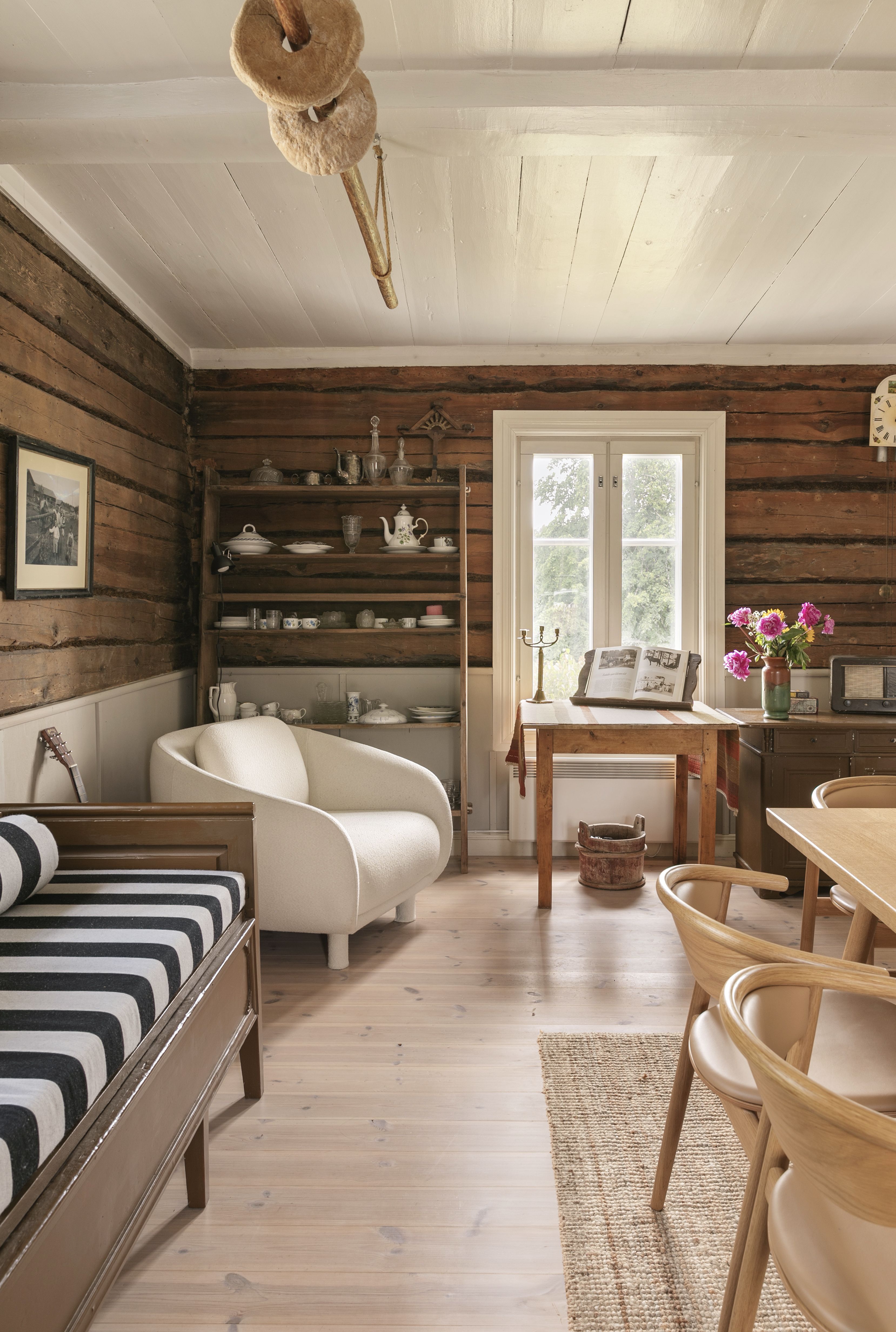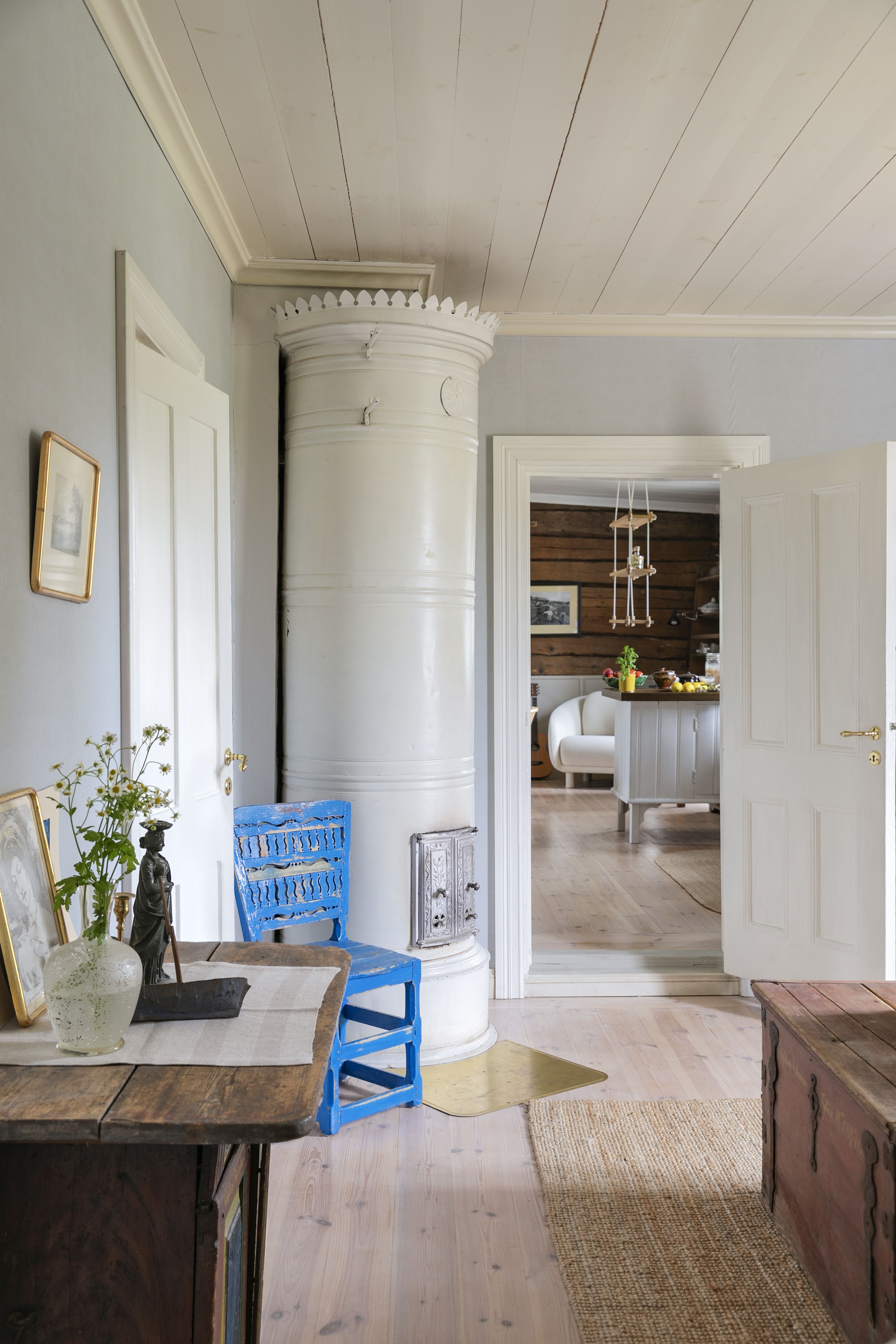 Annaleena: Jo ensimmäisellä vierailullani Vähä-Ruolaan tunsin taloon syvää yhteyttä. Aluksi se tuntui vähän museomaiselta, vaikka ihana olikin. Pienillä muutoksilla saimme talon perheelle sopivammaksi. Eka sanoo, että "hakoloitin" taloa uudella sohvalla, sängyllä, nojatuolilla ja vanhan puusohvan uusilla pehmusteilla. Olemme jatkaneet talon elämää sen henkeä kunnioittaen ja tuoneet hieman uusia elementtejä, jotka sopivat yhteen vanhojen kanssa.