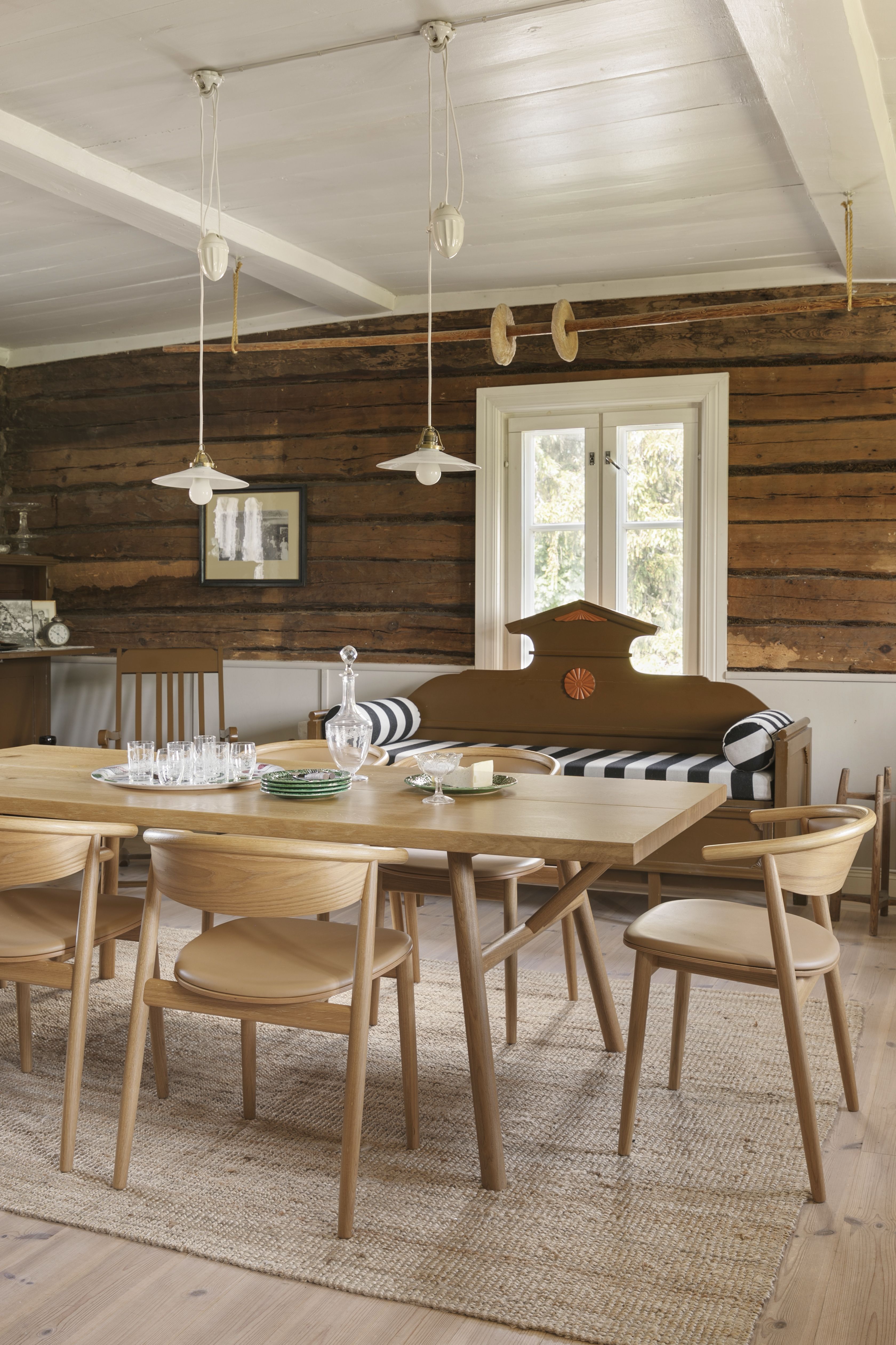 Aikakauden arvostaminen on meille keskeistä. Kotimme Lauttasaaressa, joka rakennettiin 1960-luvulla, heijastelee tuon aikakauden estetiikkaa. Sen ajan kalusteet ja yksityiskohdat tuovat kotiin aitoa henkeä ja sitovat sisustuksen taloon. Kustavissa oleellista on vanhempieni iso työ entisöinnin yhteydessä. Suuria muutoksia ei ole ollut tarkoituksenmukaista tehdä. Alkuperäiset huonekalut ovat ensisijaisesti omilla paikoillaan. Uudet huonekalut tuovat ripauksen meidän tarinaamme osaksi kokonaisuutta, sillä osa uusista huonekaluista on Annaleenan muotoilemia. Esimerkiksi tupaa hallitsee Hakolan Woody-pöytä. Annaleena on alun perin vuonna 2013 suunnitellut pöydän erään pariskunnan kesäpaikalle juuri Kustaviin.