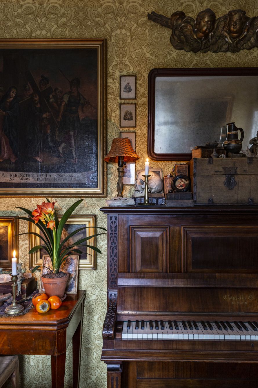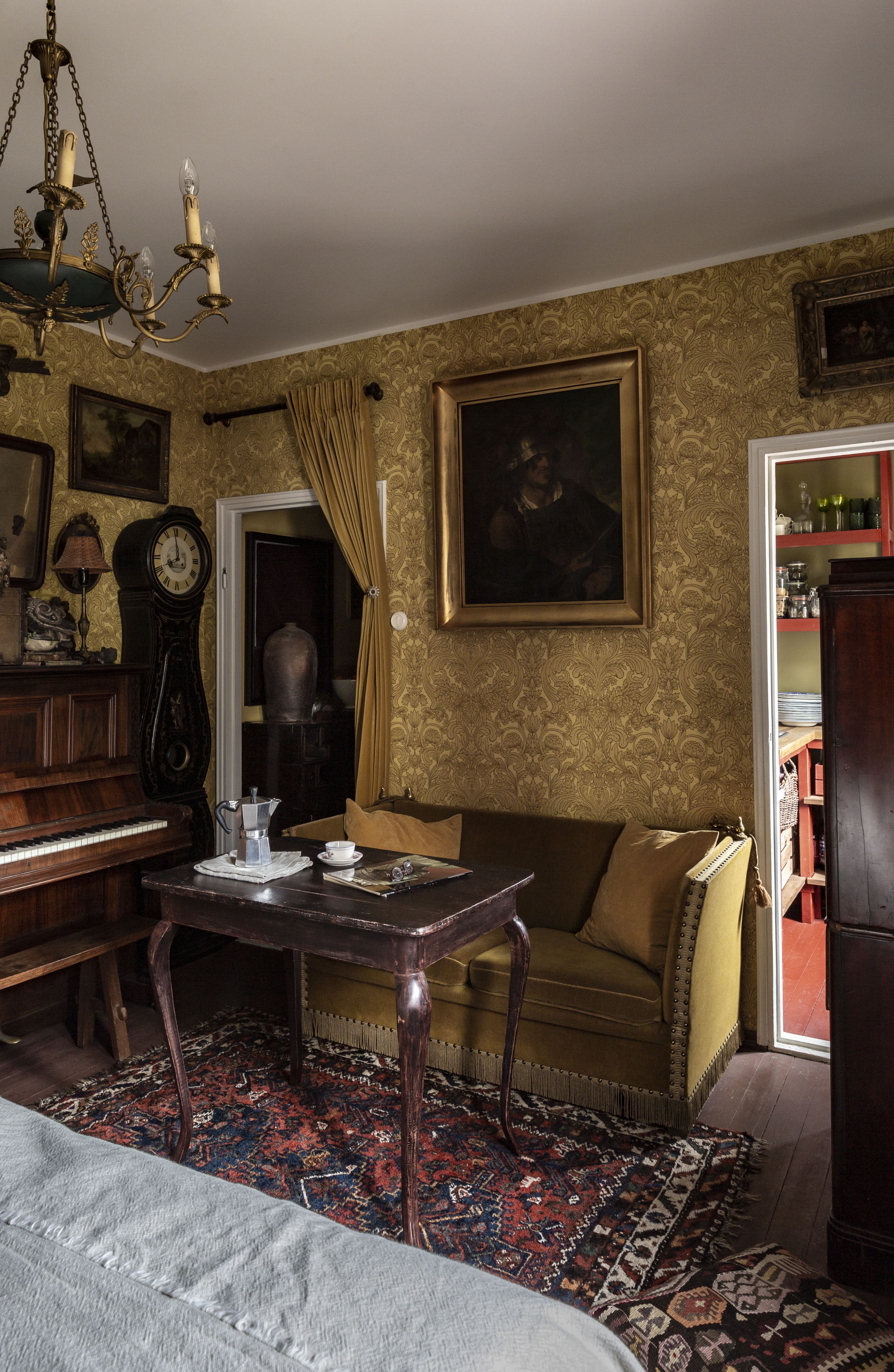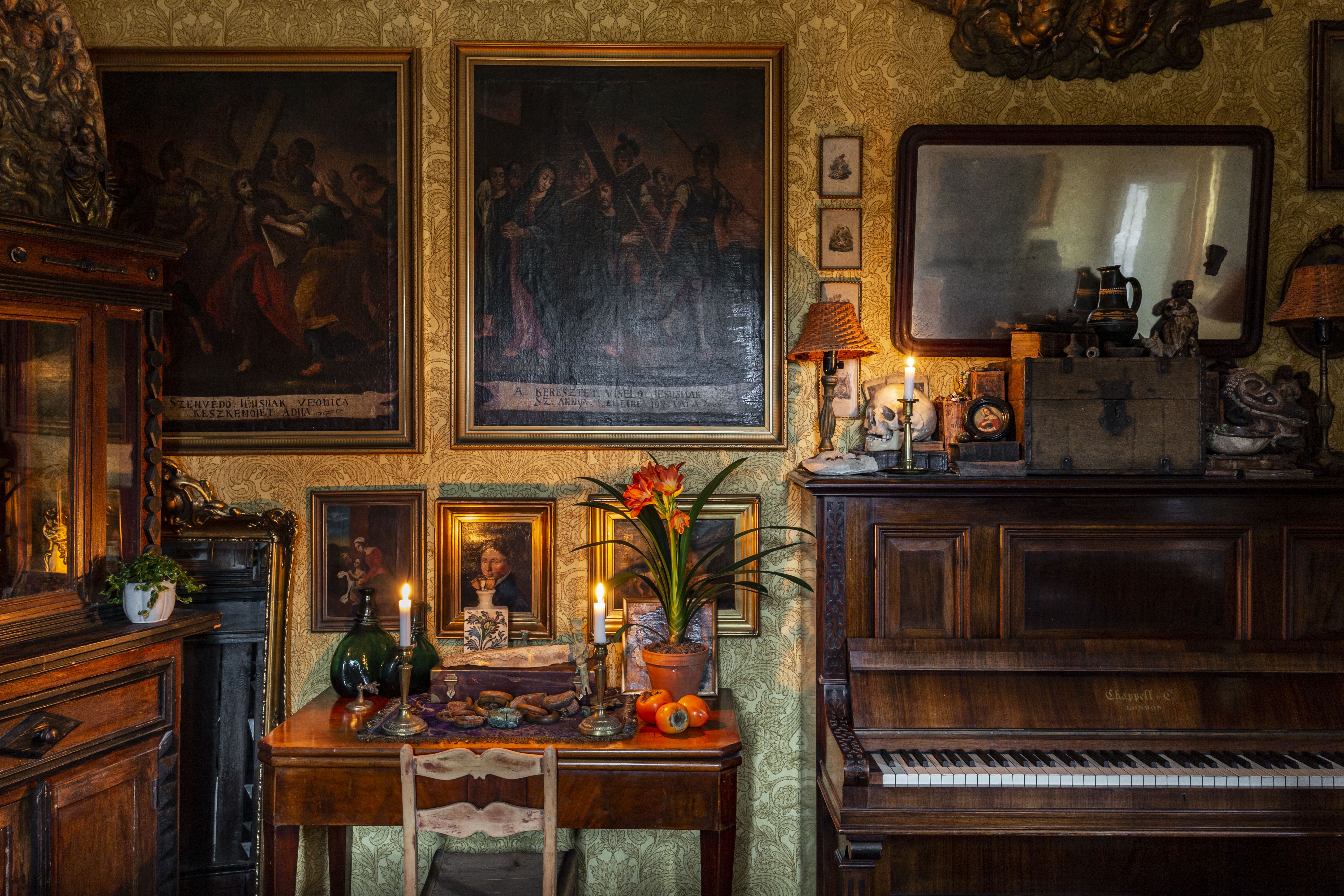 Raskaat kullansävyiset samettiverhot, runsaat tapetit, piano ja antiikkimatot sekä tilan tuoksu- ja äänimaailma vievät tulijan todellakin suoraan ovelta toiselle vuosisadalle.