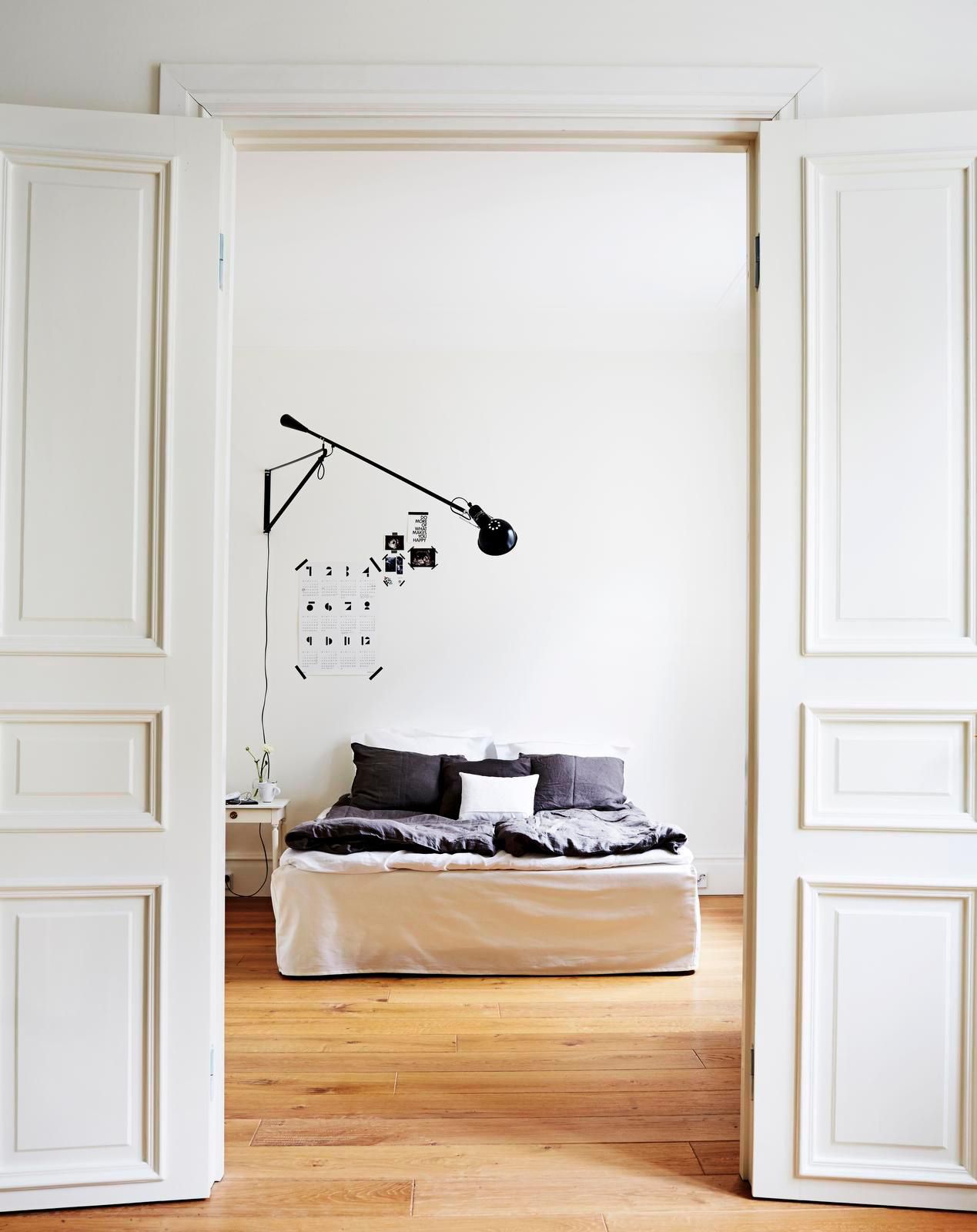 Makuuhuoneen pariovet ostettiin ystävän asunnosta Kruununhaasta. Parisängyn reunalakanan on tilattu Bemziltä. Muut sänkyvaatteet ovat Balmuirin sekä H&M:n. Flosin valaisin on Zarrosta.