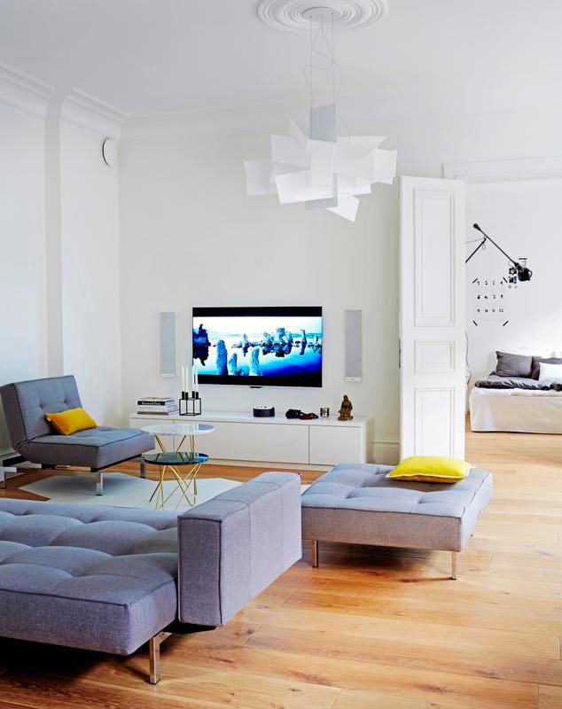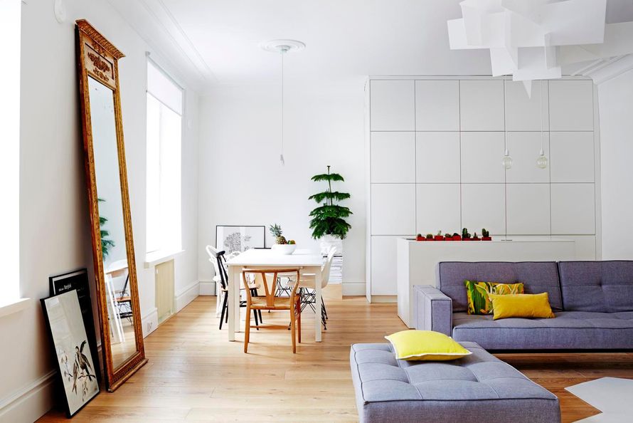 Vaalea helsinkiläiskaksio remontoitiin moderniksi, mutta talon satavuotias historia saa näkyä. Olohuoneen ja keittiön iso, avoin tila on yhdistetty kahdesta yksiöstä. Asunnon kaikki seinät on maalattu Tikkurilan Harmonyn sävyttämättömällä A valkoisella ja katot saman valmistajan Lumi-maalilla. Koristeellinen antiikkipeili on Bukowskis Marketista. Asunnon kattolistat on tehnyt puuseppä Aleksi Vallemaa.