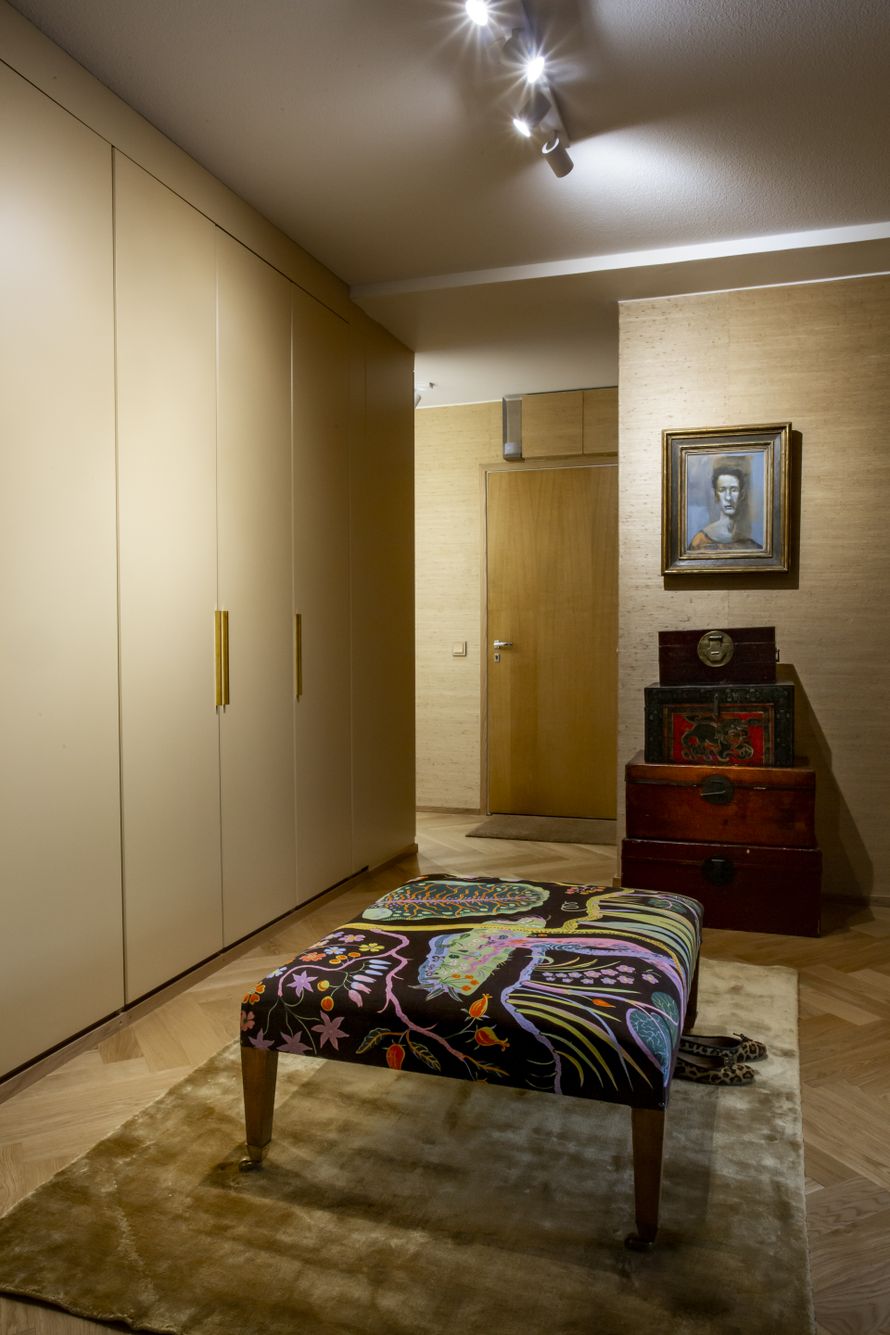 Koska eteishallimme on keskellä asuntoa ja näkyy myös olohuoneeseen, en halunnut sen näyttävän tekniseltä vaatesäilytys- ja läpikulkutilalta. Eteisen tunnelma ja tuoksut virittävät sisään tullessa aistit vastaanottamaan muun tilan. Olen aina haaveillut eteishallista, jonka keskellä olisi pyöreä pöytä. Tässäkään kodissa en sitä voinut saada, mutta vanha rahi, joka päällystettiin Josef Franckin suunnittelemalla värikkäällä Hawaji -kankaalla, toimii sekä istuimena että esteettisenä yllätyksenä.