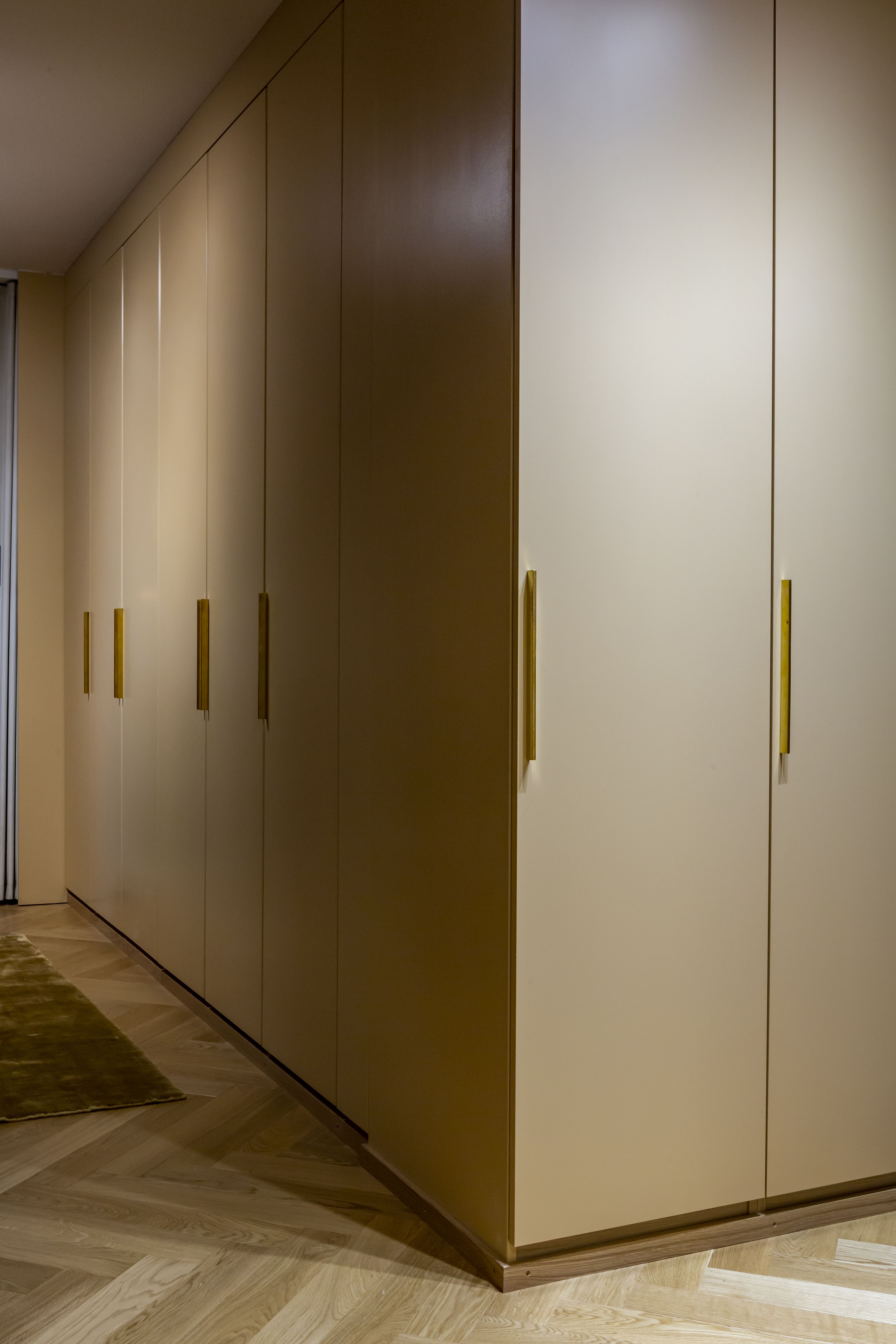 Entisen koivulaminaatin tilalle valittiin talon henkeen sopiva lakattu tamminen kalanruotoparketti, joka asennettiin liimaamalla ja ilman kynnyksiä avoimeen tilaan. Alkuperäisen eteiskalusteen tilalle saimme viisi metriä toimivaa säilytystilaa asentamalla paikalle Ikean Pax -kaapiston 230 cm korkeita runkoja. Ne listoitettiin katosta lattiaan ulottuvaksi tasaiseksi pinnaksi. Ovet maalautettiin tapetista astetta vaaleammalla toffeen sävyllä, jolloin tilan kaikki pinnat ikään kuin sulautuvat toisiinsa. Harmoninen väritys sallii sisustukseen hyvinkin erilaisia tyylejä ja värejä.