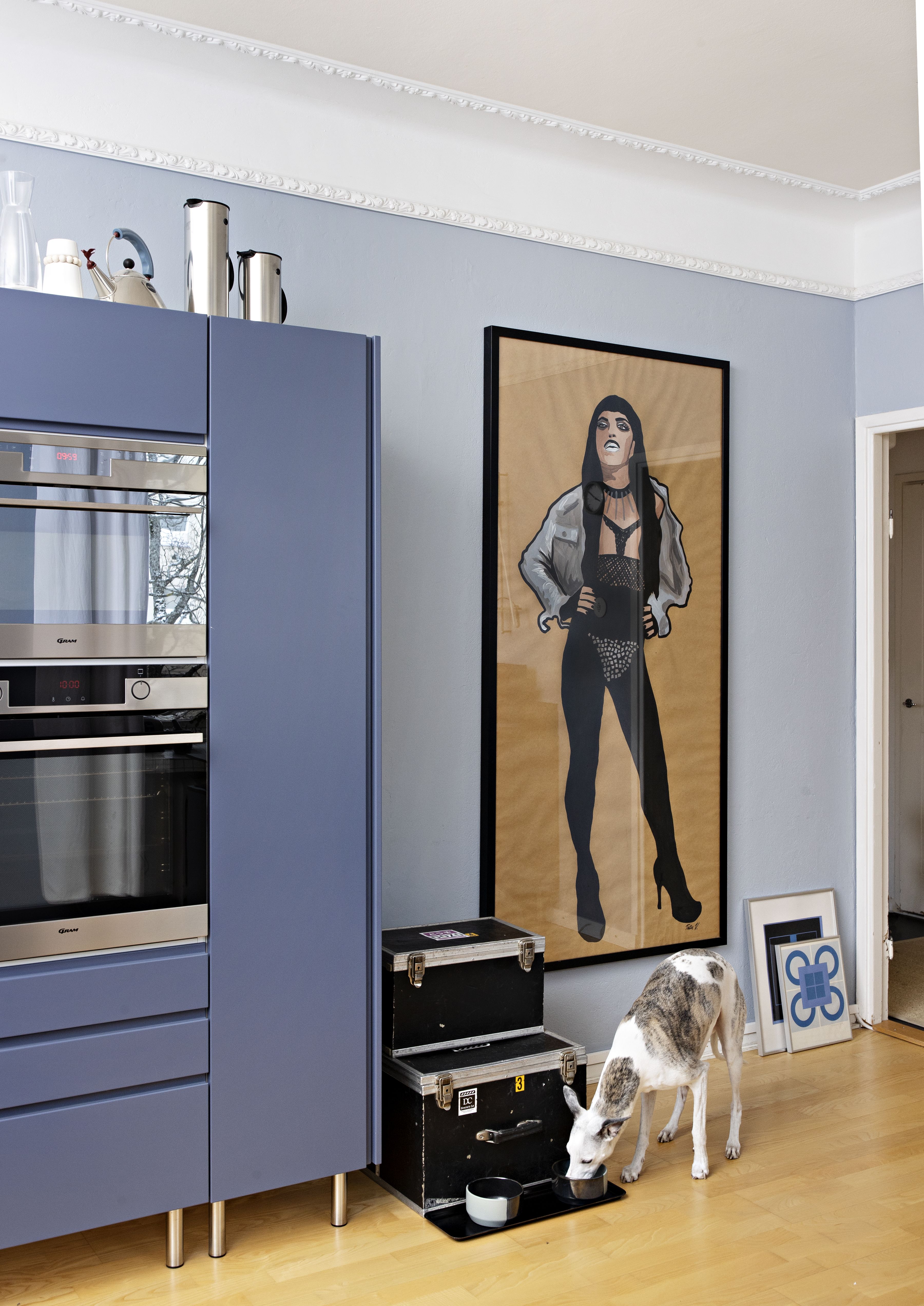 Muutimme tähän kotiin vähän ennen putkiremonttia ja pohdimme huonejärjestystä. Keittiömme oli alun perin makuuhuone. Arvoimme keittiön siirtämistä, sillä halusimme kunnioittaa alkuperäistä mahdollisimman paljon. Remonttia odotellessa ajatus siirrosta kuitenkin kypsyi, ja se on ollut hyvä ratkaisu. Leivon paljon, ja työskennellessä näkee kahteen suuntaan ulos. Halusimme räväkän värin ja päädyimme mieheni Asmon yrityksen, Helno-keittiöiden indigon siniseen. Yläkaapit jätettiin tarkoituksella laittamatta, seinät tasoittamatta ja ikkunalautojen 1980-luvun laatat poistamatta. Roso ja vuosien kerrostumat saavat näkyä.