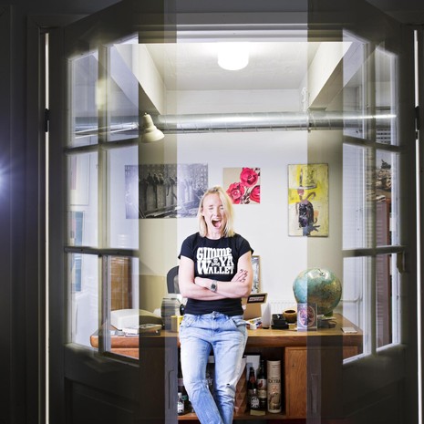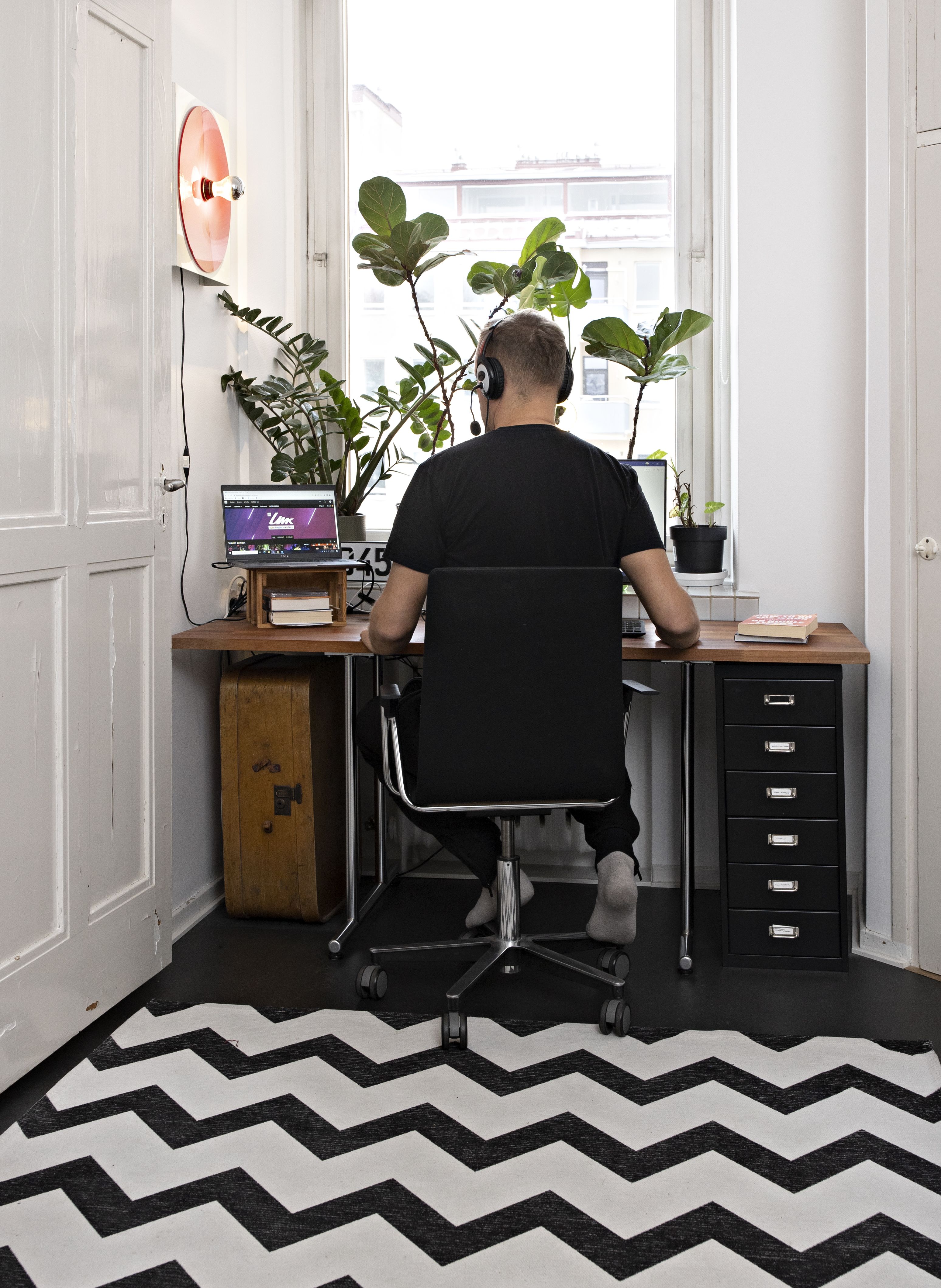 Entisen keittiön paikalla on työ- ja vierashuone. Se on hyödyksi, sillä meillä käy tiuhaan sukulaisia yökylässä. Huoneessa on viileämpää kuin muualla asunnossa, koska säilytimme vanhan kylmäkaapin huoneen nurkassa. Työskentelen pääsääntöisesti kotona, joten vietän arkena työhuoneessa paljon aikaa. Tila on pieni, mutta ikkunasta tulee hyvä valo videoiden kuvaamista ja palavereja varten. Työhuoneen ikkunalaudalla kasvatan vielä kehitysvaiheessa olevia, rumia ja kärsineitä kasvejani muoviruukuissa, vähän kuin rescuekasveina. Pitkän seinän sisällä on tallessa keittiön putket, mikäli joku joskus haluaa palauttaa alkuperäisen huonejärjestyksen.