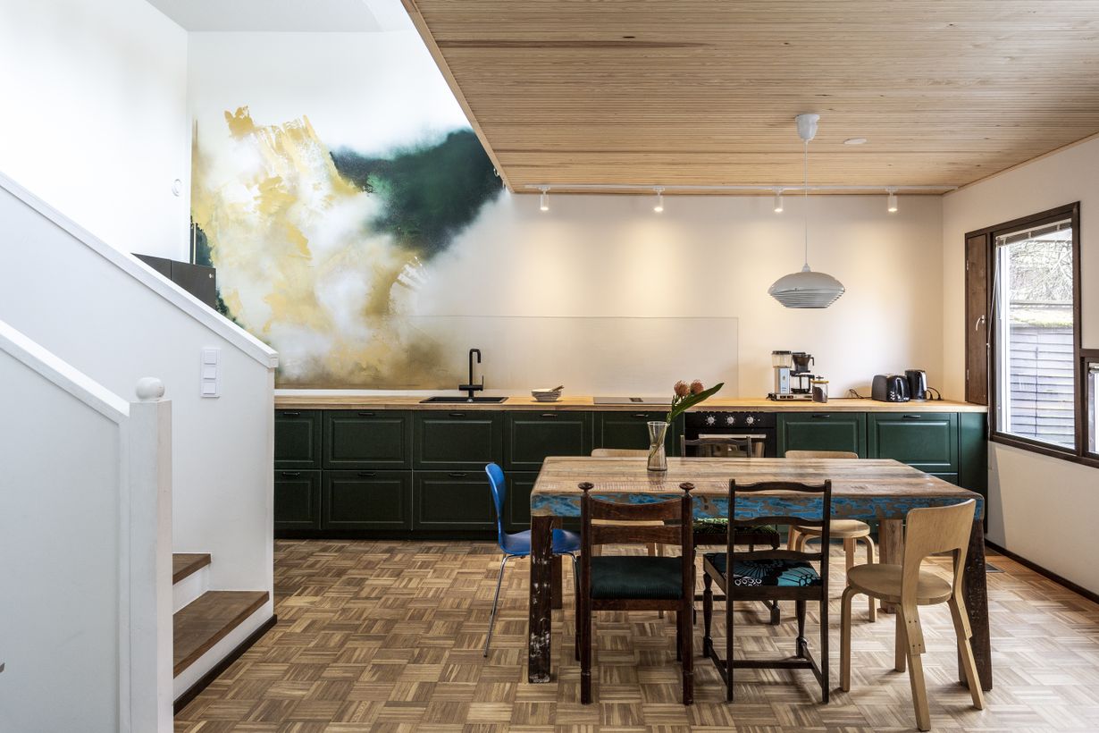 Silmä tarttuu pelkistetyssä toteutuksessa keittiön seinän näyttävään graffitimaalaukseen. Se teetettiin tilaustyönä tutulla taiteilijalla Juha Lahtisella, jonka taulu perheellä jo oli. Seinämaalaus pääsee oikeuksiinsa muutoin paljaalla seinällä, sillä Ossi ja Titti eivät halunneet keittiöönsä yläkaappeja. Kaikki astiat mahtuvat Ikean valikoimasta löytyneen kaapiston uumeniin, eikä keittiötasollakaan ole mitään turhaa tavaraa.