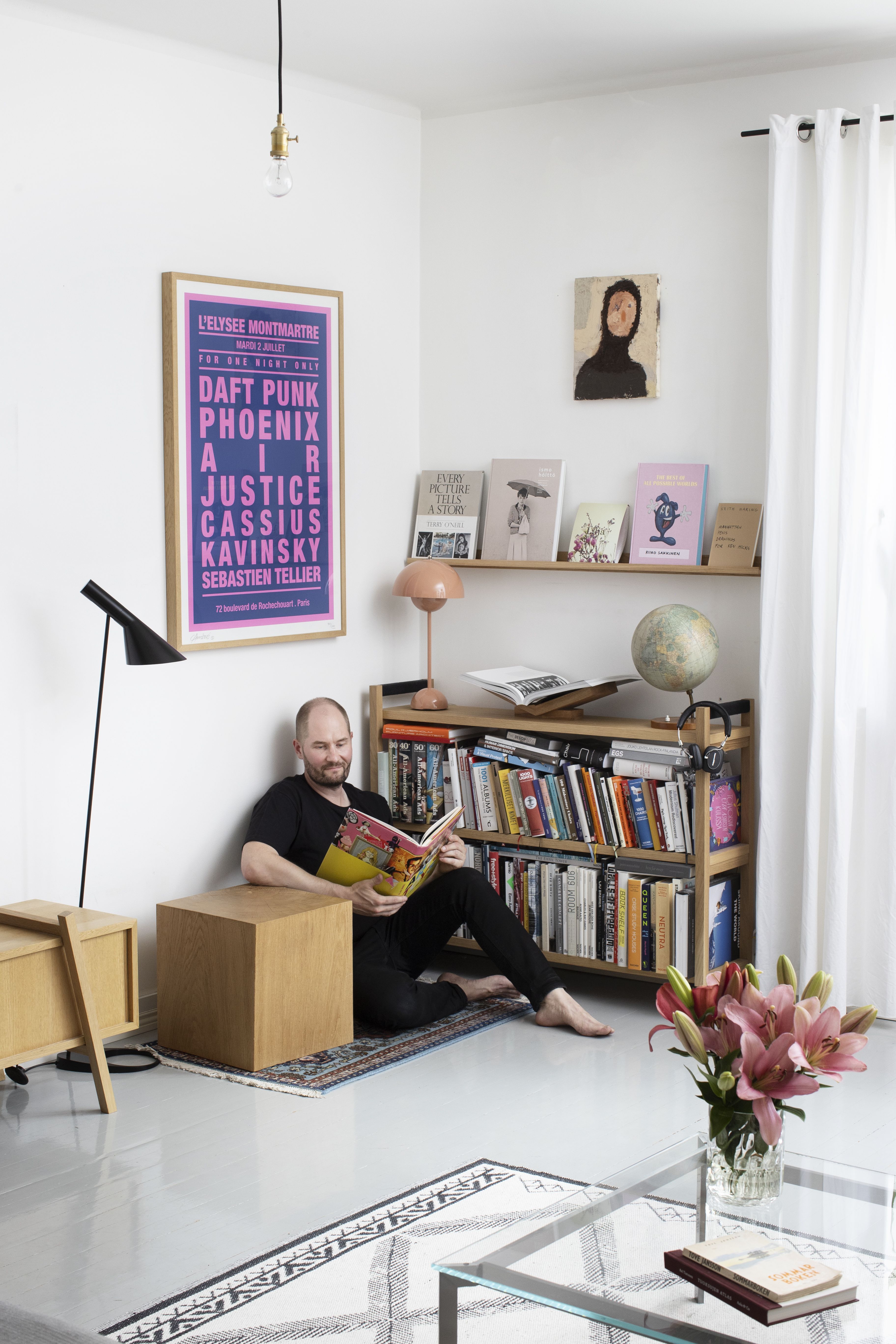 Teppo: Kirjat ovat intohimoni, mikä näkyy sisustuksessamme. Ostan niitä matkoilta. Viimeiselle reissulle annoin itselleni luvan ostaa vain kolme kirjaa. En lue kaunokirjallisuutta vaan taide- ja valokuvakirjoja, joita voin tutkia aina uudelleen. Myös valokuvaus on aina ollut läsnä elämässäni. Kun Kia ottaa monta kuvaa, minä suunnittelen kauan yhtä otosta. Toisaalta tykkään olla tarkkailijan roolissa kameran takana sen enempää suunnittelematta ja vain olemalla hetkessä.