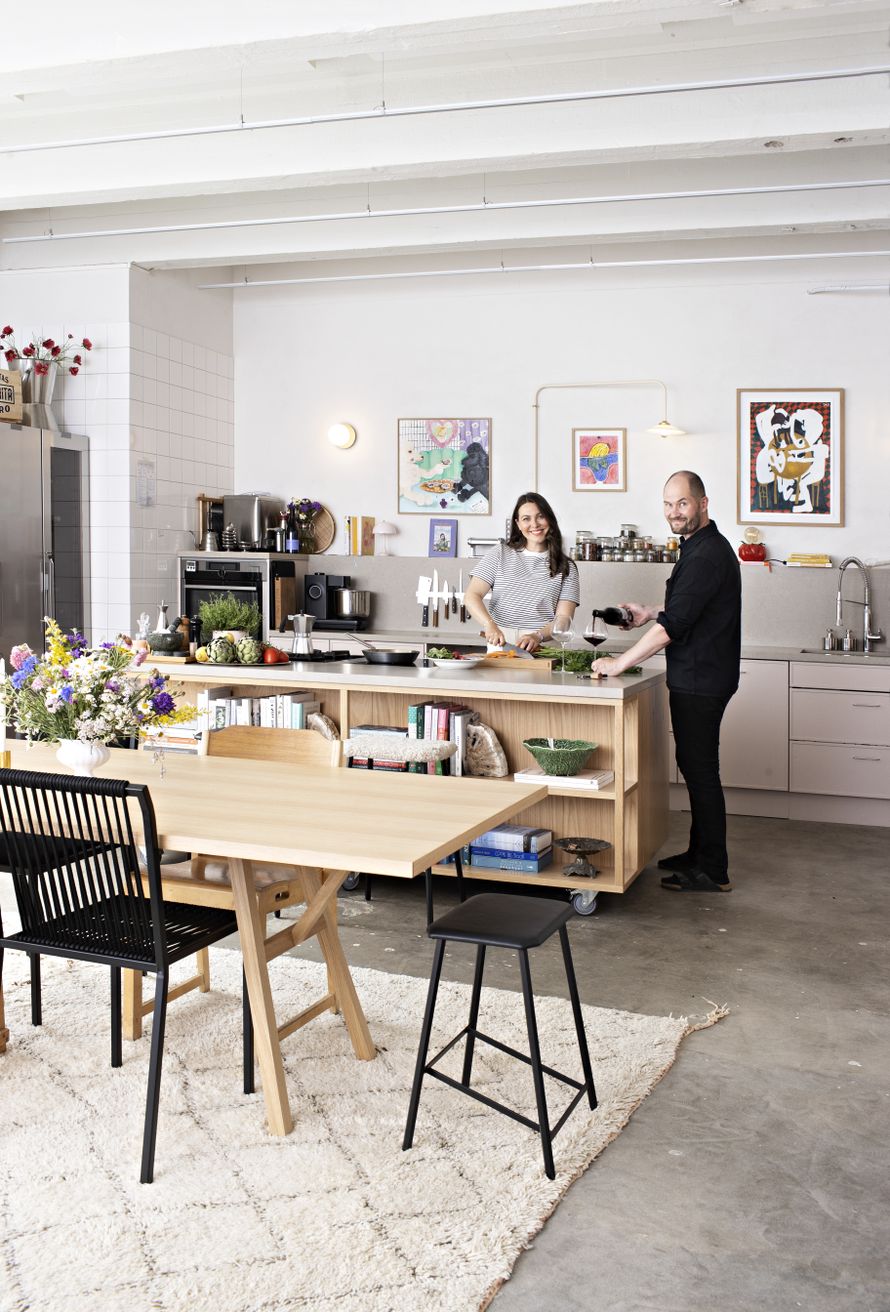 Kia: Pidämme Vallilassa sijaitsevasta kaksiostamme, mutta pienessä kodissa ei mahdu viihdyttämään ystäviä. Etsimme pitkään suurempaa asuntoa, kunnes keksimme remontoida Tepon verstaan yhteyteen Bella Table -keittiön sekä Tebianin showroomin. "Työkoti" valmistui maaliskuussa 2022, ja se on ollut unelmien täyttymys. Tuotin puolentoista vuoden ajan kaiken sisällön kodistamme, kokkasin pienessä kotikeittiössämme ja kuvasin ruoat ikkunalaudalla. Kun Teppo tuli kotiin, kaikki oli levällään. Uudessa työkeittiössä on tilaa ja valaistus on suunniteltu kuvaamista varten. Epäsuora valaistus ei tuota varjoja, ja värilämpötilaa sekä voimakkuutta saa säädettyä. Halusimme tehdä paikasta mahdollisimman kodikkaan. Ystävät käyvät täällä viikoittain syömässä. Kun Tepon asiakkaat tulevat showroomille, saattaa tarjolla olla myös testikeittiön herkkuja, kuten tuoretta pullaa.