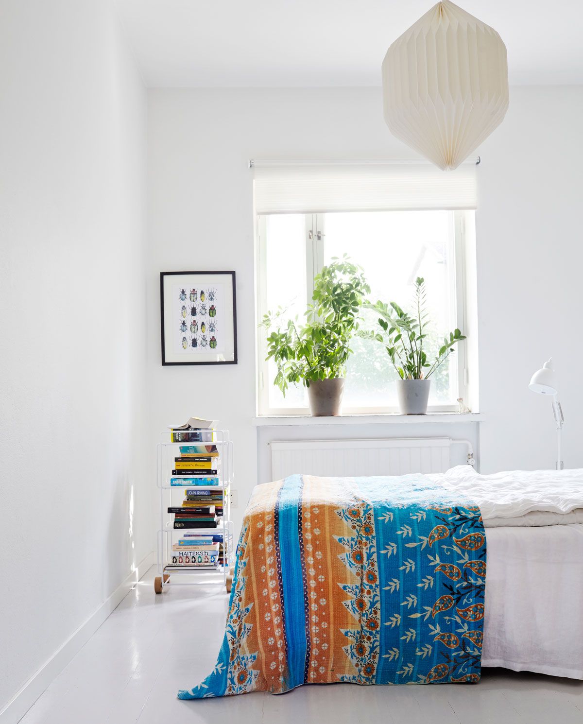 Omassa makkarissani on aina ryppyiset pellavalakanat. Värikäs päiväpeitto toimii hyvin valkoisten lakanoisen kanssa, kun petaan peiton vain puoliksi sängyn päälle. Bombay Stockholmin peitto on valmistetu vanhoista sarikankaista ja jokainen peitto on uniikki, hinta 105 e, Stockmann. Olen peittänyt runkopatjan helmalakanalla, joka muuttui konepesussa sopivan ryppyiseksi. Tampere-tarjoilukärry on Everyday designin ja riippuvalaisin Hk Livingin mallistosta. Kuva Päivi Anita Ristell.