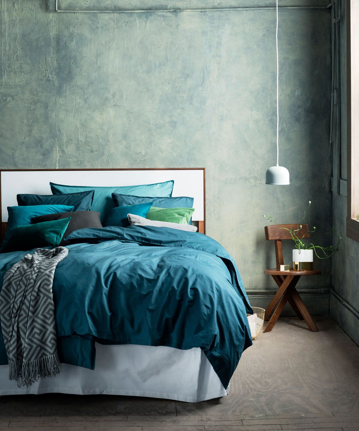 Tämä peti ei kaipaa päiväpeittoa, sillä turkoosit lakanat ovat houkuttelevat sellaisenaan ja runsas tyynyasetelma korostaa vielä petauksen rentoa tyyliä. Tässäkin petauksessa on tärkeää, että tyynyissä on eri sinisen sävyjä. Pussilakanat 20 e/kpl ja tyynynpäälliset 8 e/kpl ja huopa 30 e, H&M Home.