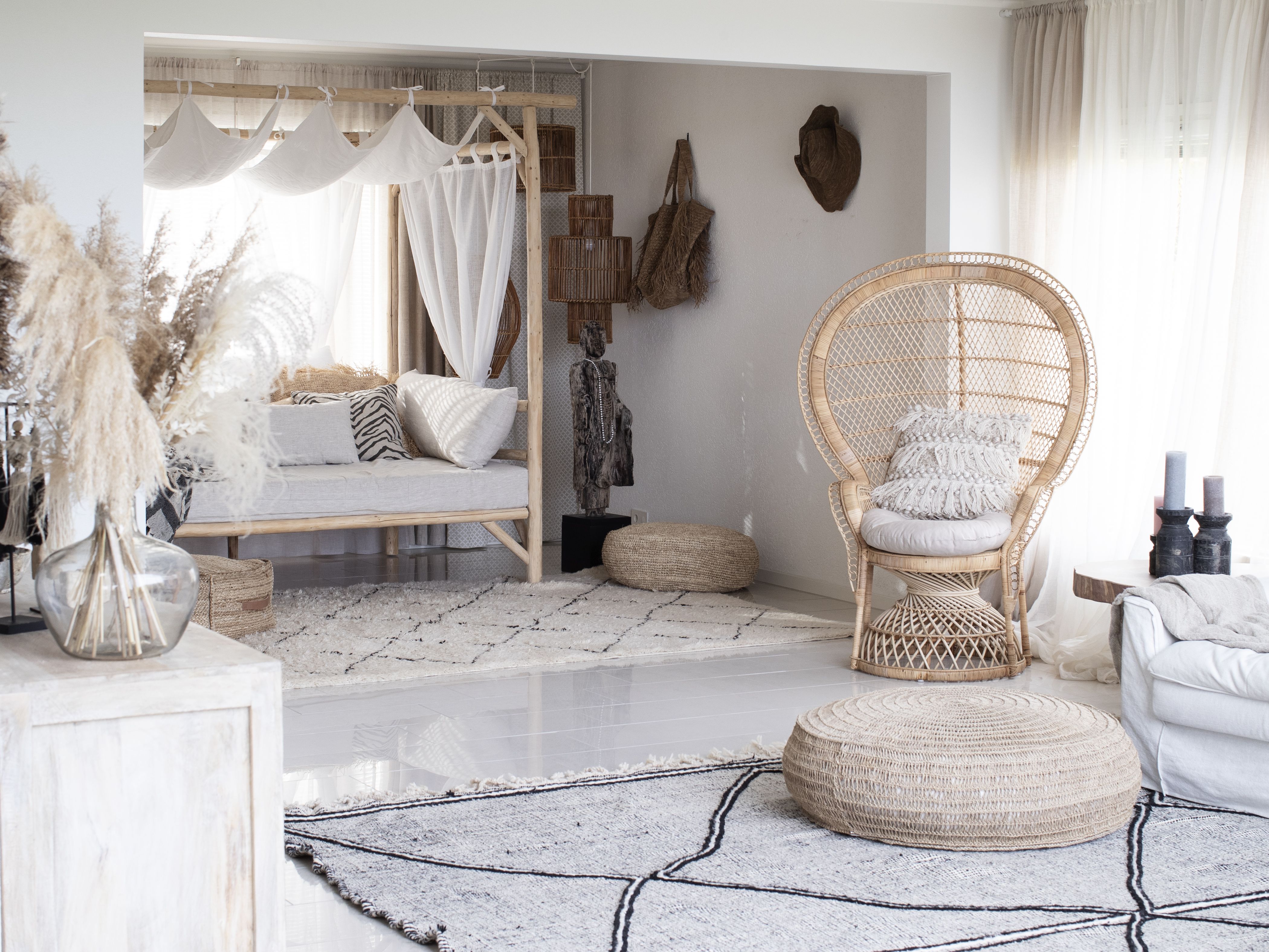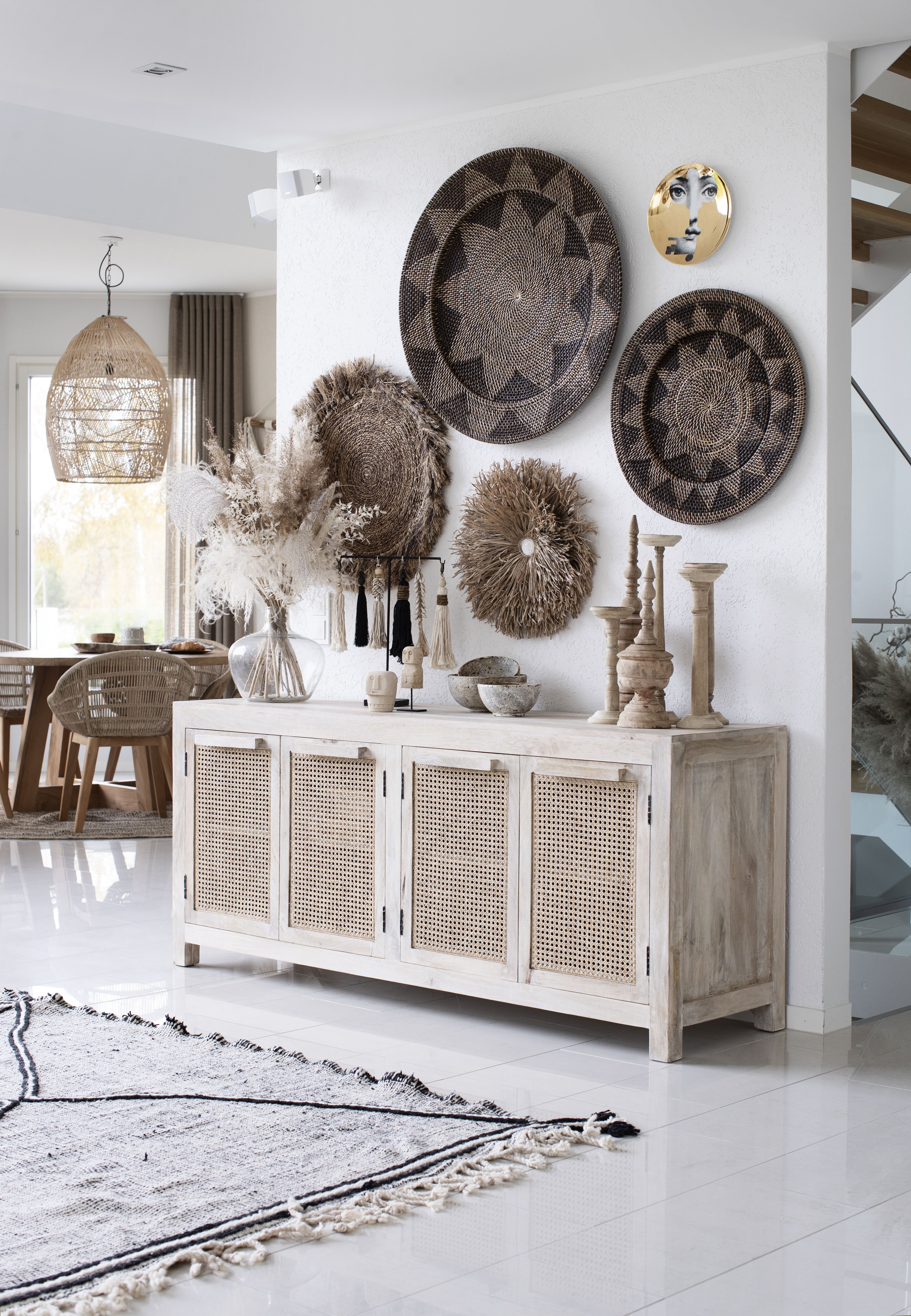 Koti elää ja kehittyy siinä missä muukin elämä. Siksi yksi olohuoneemme seinistä on varattu muutokselle. Vaihtelen sinne esineitä tunnelmien ja vuodenaikojen mukaan. Tällä hetkellä seinän edustalla on senkki, jonka yläpuolella on koristelautasia ja ystävältä saatu taulu. Lisäksi senkin päällä on boho-hengen mukaisesti kuivia heiniä. Vaikka tyylimme on rönsyilevämpi ja värikkäämpi kuin ennen, en pidä siitä, että kotiimme tuodaan tavaraa. Läheisemme tietävät tämän. Ystävältä saatu naamataulu on poikkeus, se on rakas. Viime aikoina olen innostunut myös puusta materiaalina. Epätäydellinen pinta tekee siitä täydellisen.