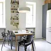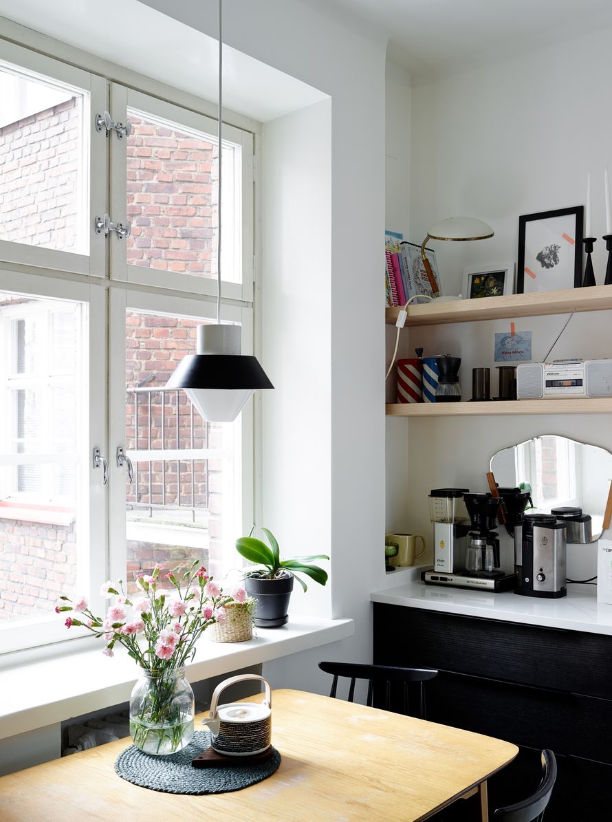 Keittiön seinää siirrettiin makuuhuoneen puolelle miltei metri. Saatuun lisätilaan sisustussuunnittelija Anne-Marie Reinikka suunnitteli paljon tavaraa vetävät laatikostot. Taustaseinä oli alkuperäisessä suunnitelmassa musta, mutta se maalattiin kuitenkin suunnittelijan ehdotuksesta valkoiseksi. Lamppu on kirppislöytö.