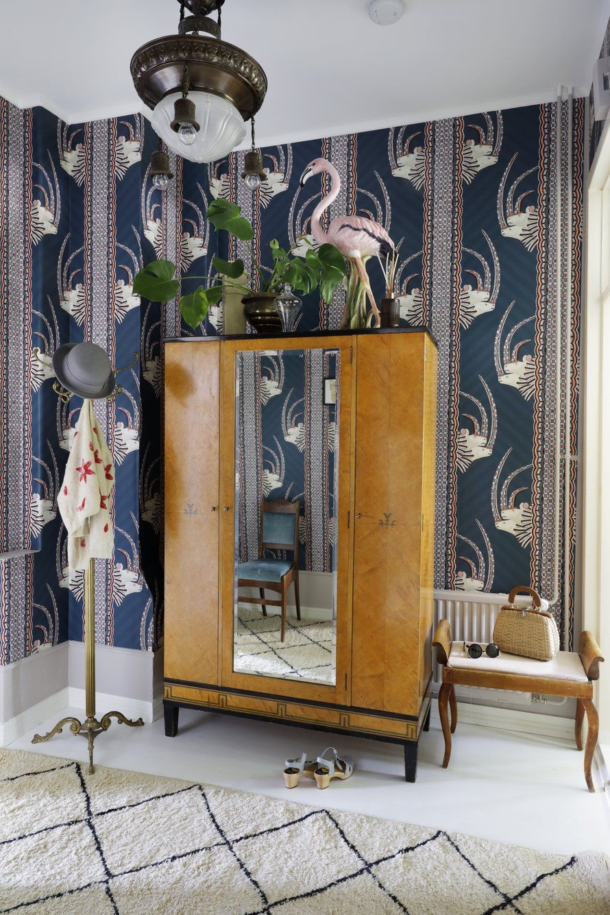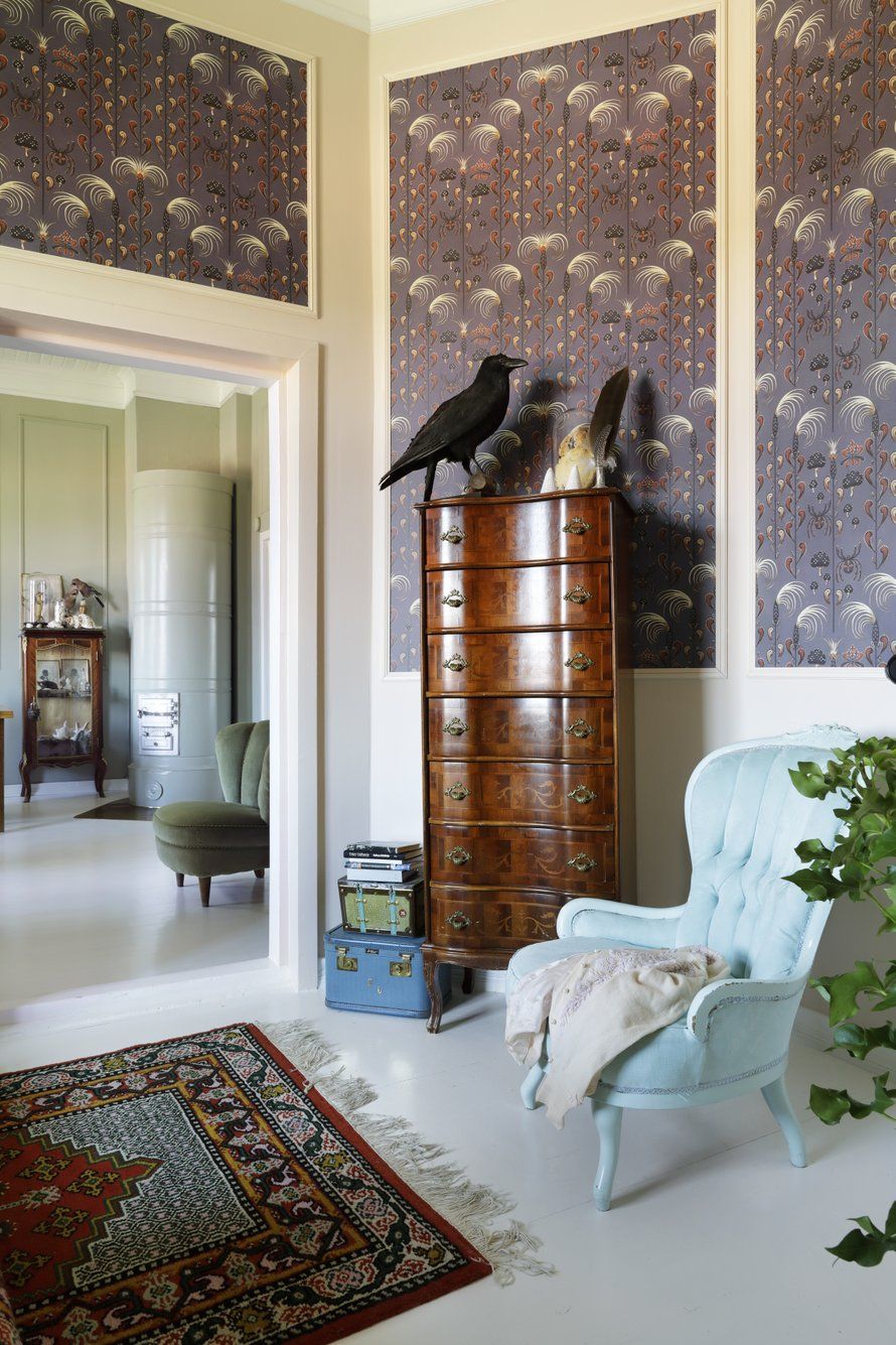 Emme halunneet muuttaa asunnon alkuperäistä luonnetta, joten teimme vain pintaremontin. Kaikki pinnat maalattiin lattioita myöten. Olin ihastunut Klaus Haapaniemen Spider-tapetiin, ja se oli lähtökohtana muulle sisustukselle. Kokosin tapetin pohjalta väri- ja tekstiilisuunnitelman ennen kuin ryhdyimme toimeen.