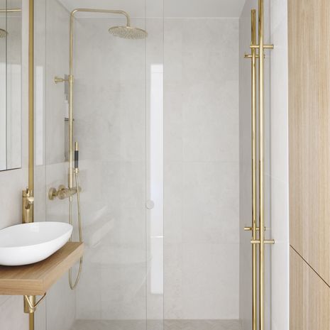 Remontti oli toteutettava pikaisesti, kun perhe oli lomalla ja remonttimiehet saatavilla. Kiireestä huolimatta asukkaat eivät kuitenkaan halunneet tyytyä kompromisseihin. Tilaan haluttiin luoda rauhallinen, laadukas tunnelma ja ripaus ylellisyyttä. Kaakeleiden päälle maalaaminen ei tullut siis kysymykseen.
