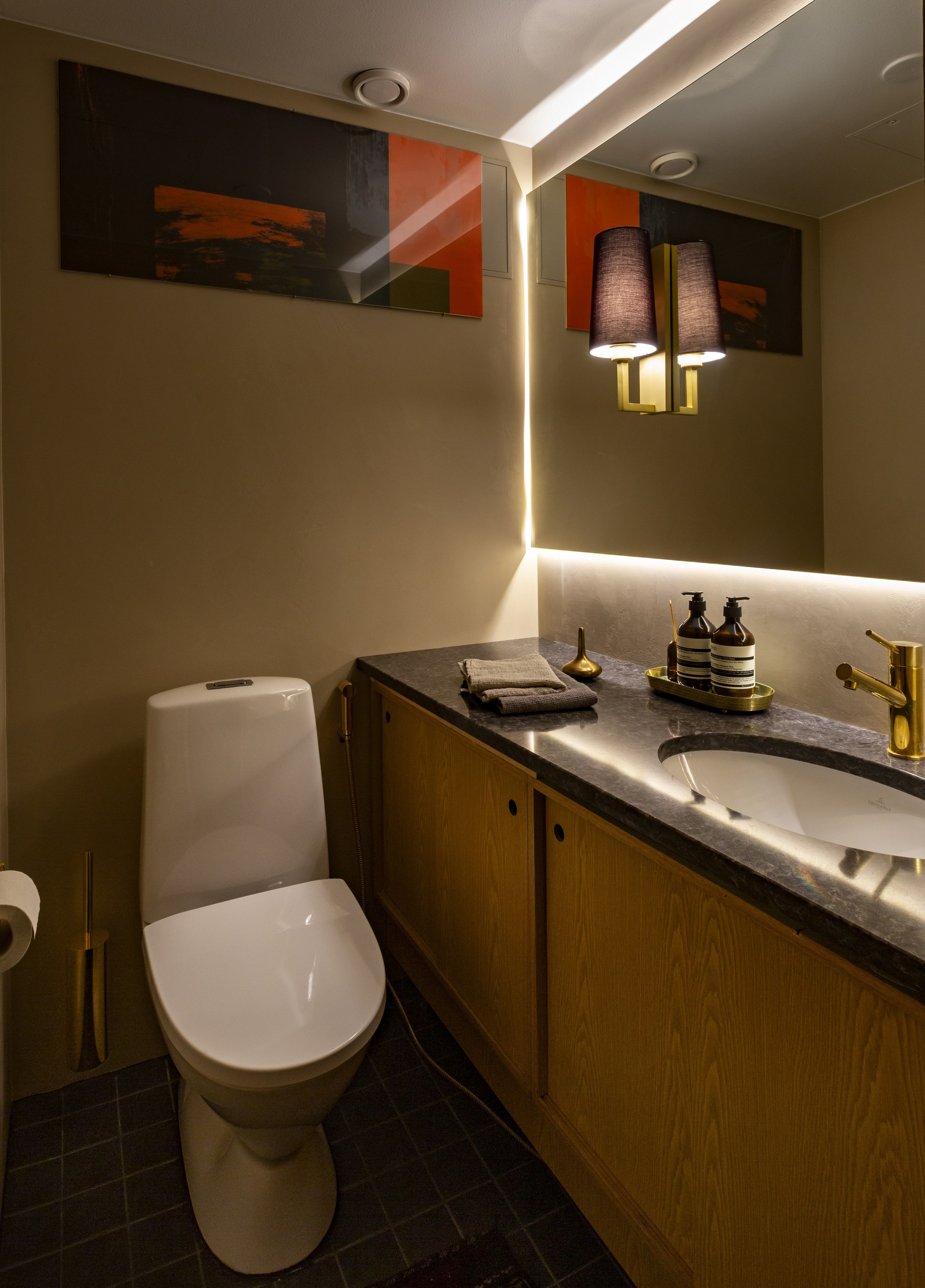Löytääkseen oikeat elementit toivomansa tunnelman saavuttamiseksi asiakkaat pyysivät apuun Bang Interiorsin sisustussuunnittelija Anna Bargumin. Hän laati kaksi erilaista kuvakollaasia tuotteilla, jotka olisivat nopeasti saatavissa. Tämä oli kiireisen remonttiaikataulun kannalta avainasia. Tehtävä oli suunnittelijalle haastava, sillä tiukka aikataulu karsi monia vaihtoehtoja eivätkä asukkaat halunneet tehdä suuria kompromisseja. Annan taustatyön ja visuaalisten suunnitelmien avulla pieneen vierasvessaan saatiin tiukasta aikataulusta huolimatta runsaasti tunnelmaa.