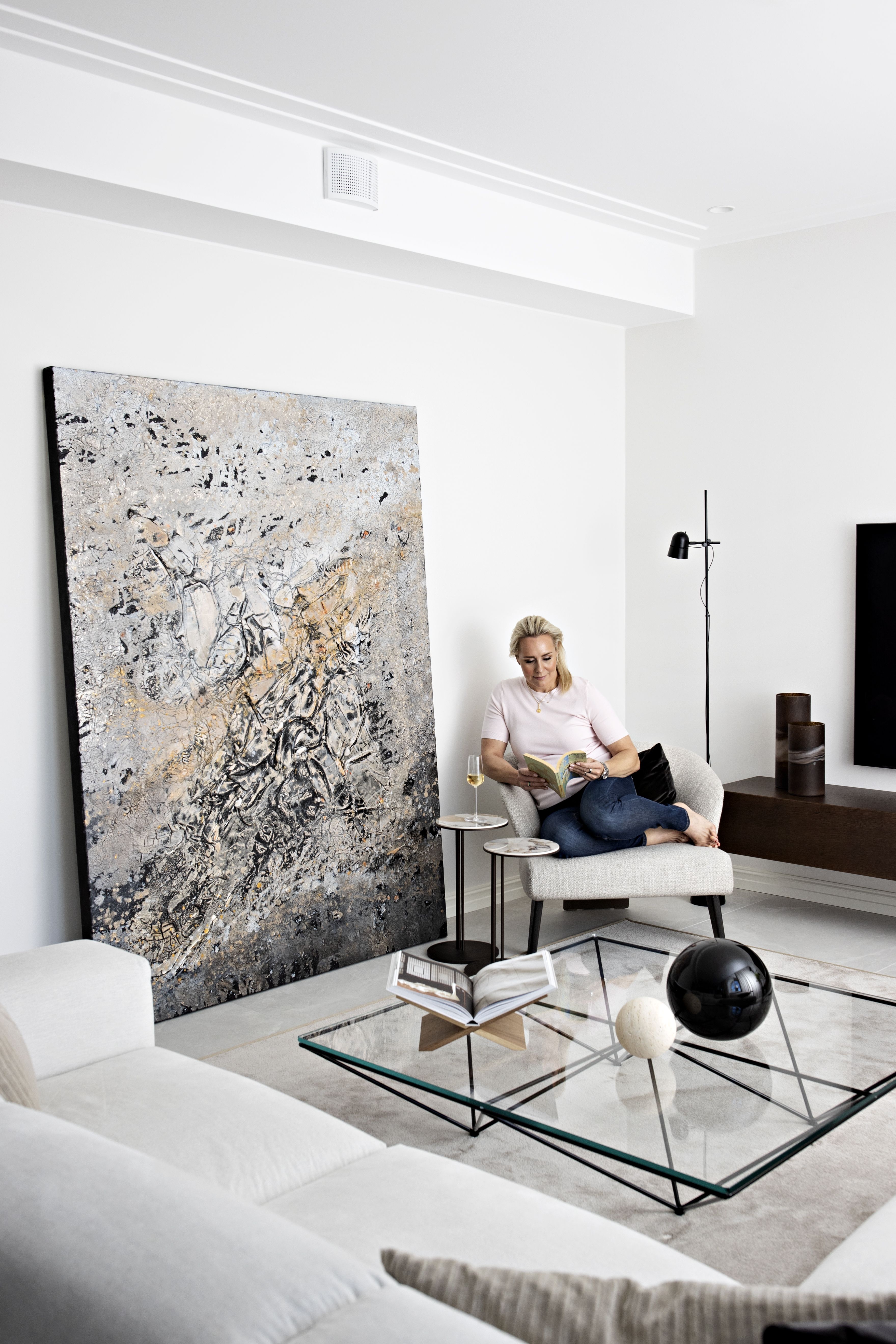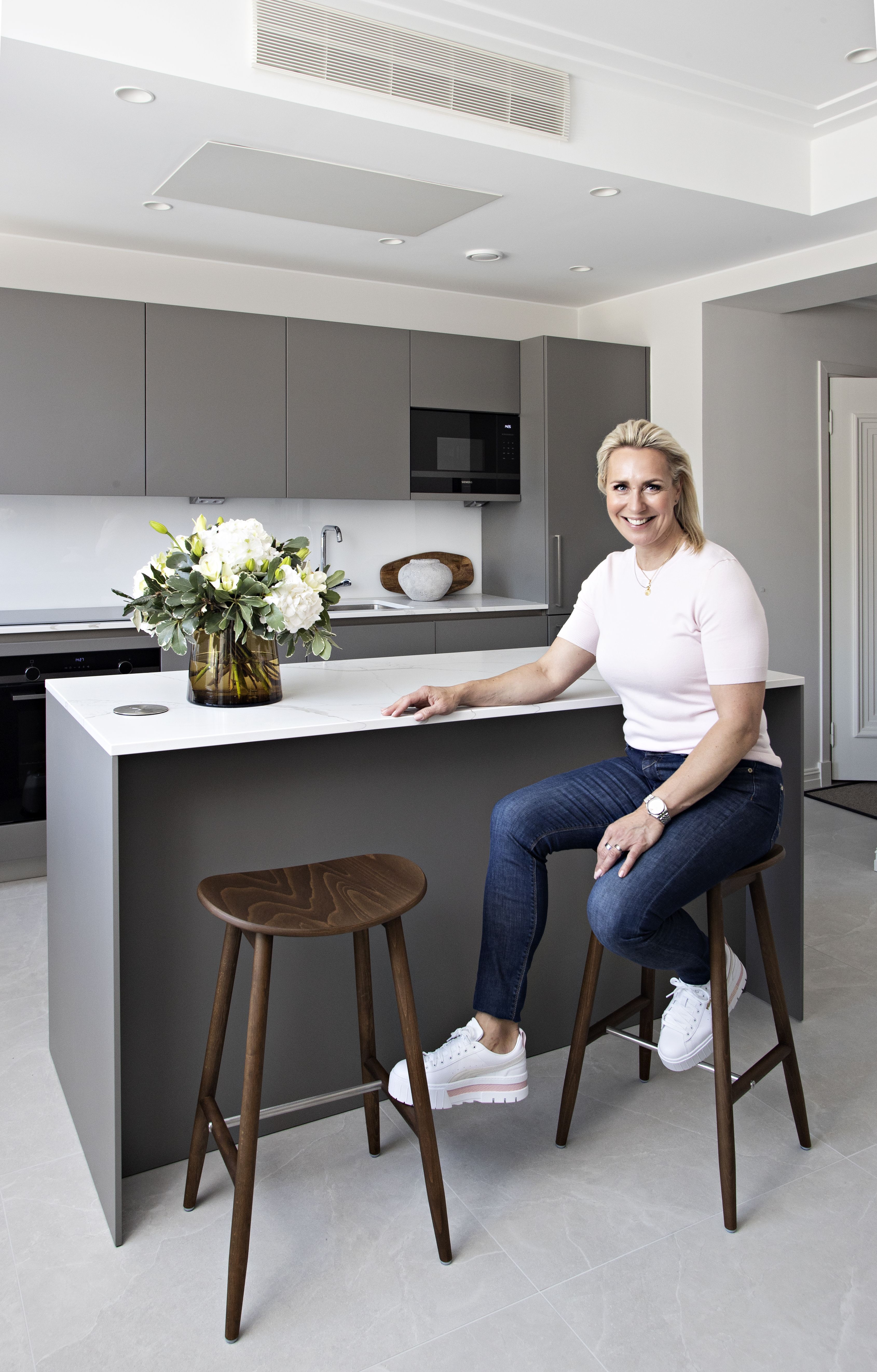 Tunnelmanluonti on minulle tärkeää: soitan musiikkia, ostan leikkokukkia ja poltan kynttilöitä vuoden ympäri. Olemme mieheni kanssa aika siistejä ja järjestelmällisiä. Jos työskentelen kotona, siivoan ensin, sillä sekasotku luo levottomuutta ja haittaa keskittymistä, jos on tiskit ja rojut levällään. Keittiö-ruokailutila-olohuone on pitkä ja kapeahko tila, joka olisi ollut vaikea rytmittää mittasuhteisiin ja eri toimintoihin sopivaksi ilman ammattilaisten apua. Deco Designin sisustussuunnittelijat Milla Salonius ja Anna-Kaisa Ervasti saivat meidät pehmentämään värimaailmaa pois tutusta ja turvallisesta, aiempien kotien vitivalkoisesta sisustuksesta.