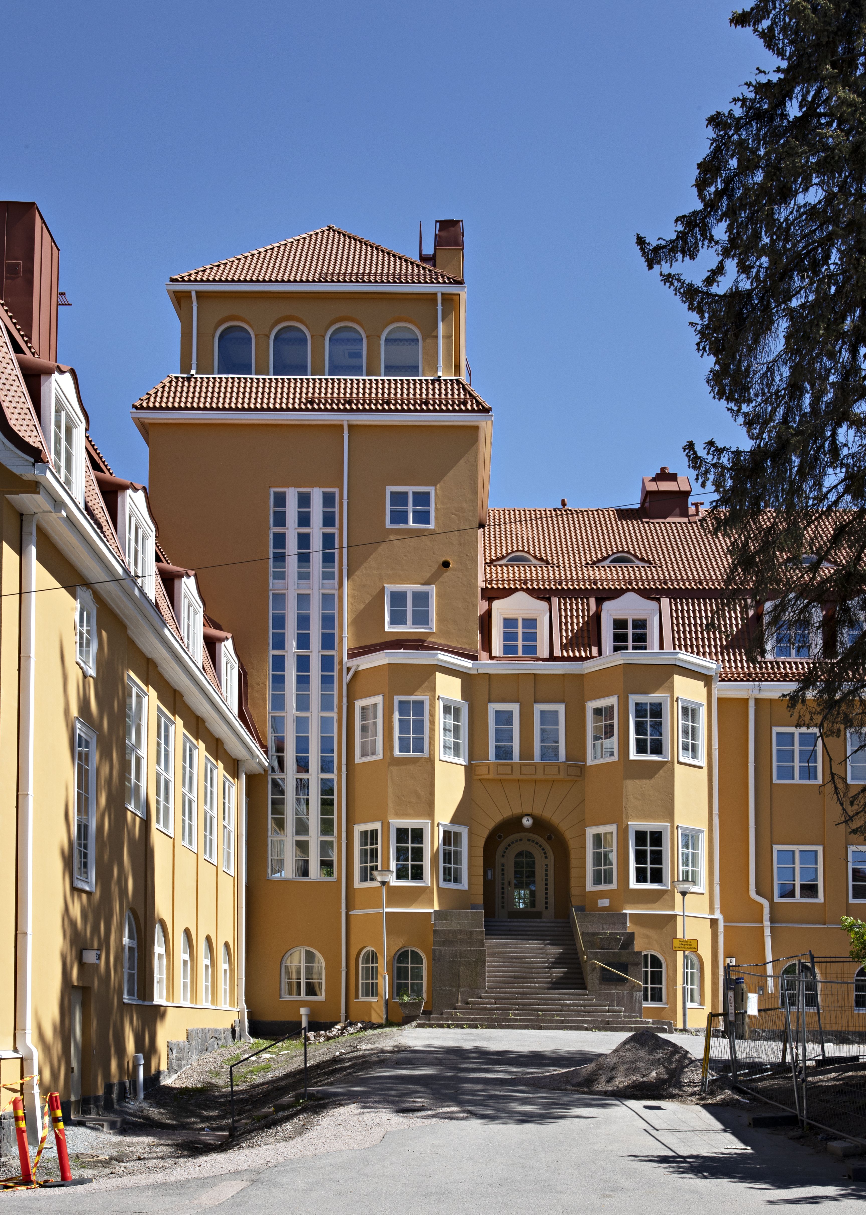 Munkkiniemen Kadetti on näyttävä kokonaisuus. Eliel Saarisen suunnittelema jugendrakennus oli meille jo entuudestaan tuttu, onhan tämä yksi Munkkiniemen maamerkeistä. Rakennus oli alkujaan pensionaatti ja sittemmin kadettikoulu. Myöhemmin muun muassa Ilmavoimien esikunta ja tullihallitus ovat toimineet tiloissa. Talon tarina on kiinnostava. Erään naapurin asunnossa yksi huoneista on aikoinaan ollut kadettikoulun arestihuone. Pidän siitä, että saneerauksessa säilytettiin alkuperäisiä, suojeltuja tiloja. Pensionaattiin viittaavia hotellimaisia piirteitä on tallella edelleen. Yhteistiloista löytyvät esimerkiksi parkkihalli, kuntosali, viinikellari, sauna ja uima-allas.