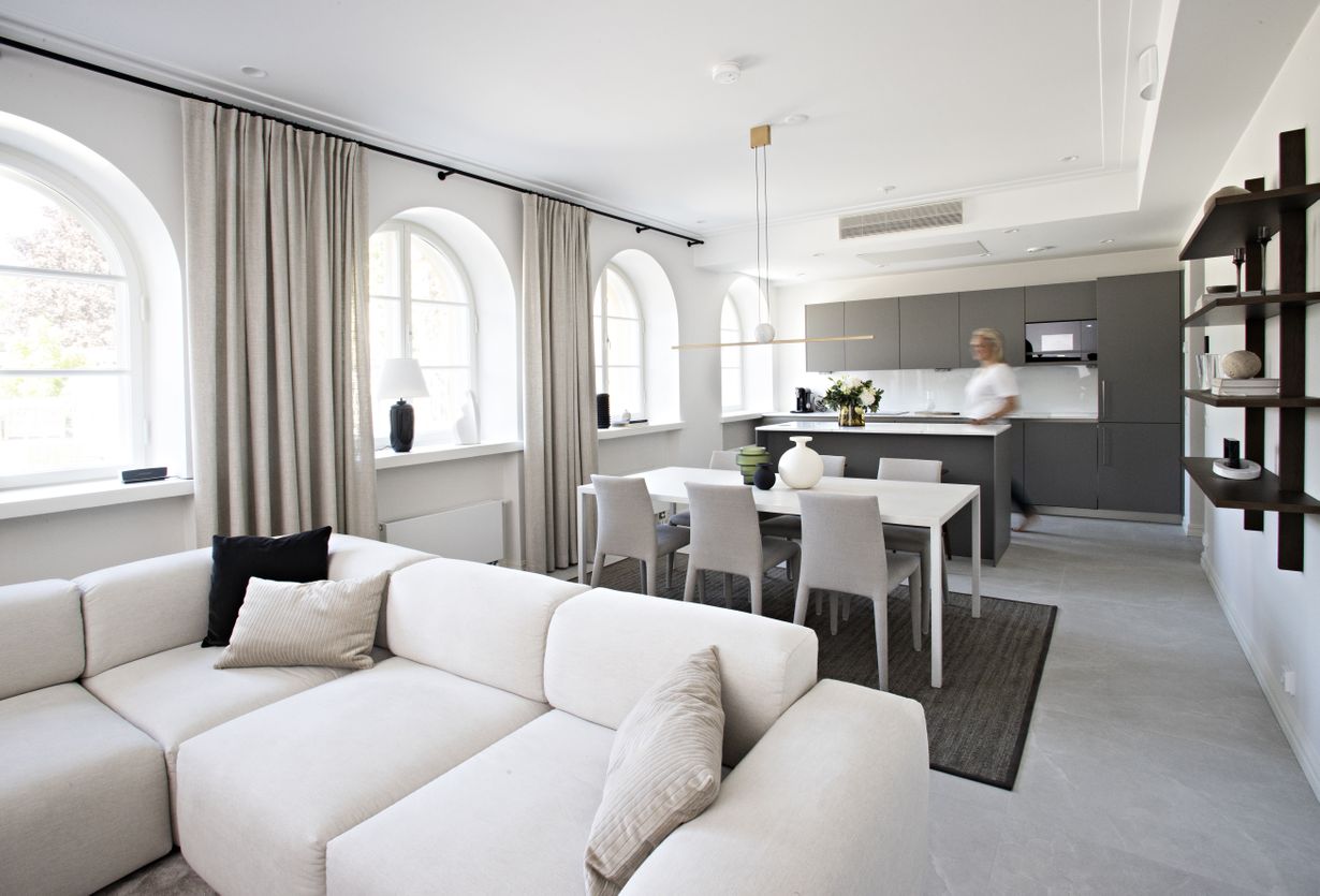 Koti historiallisessa Munkkiniemen Kadetissa hurmasi Mervi Kallion kaari-ikkunoillaan – yhteistiloista löytyvät kuntosali, uima-allas ja viinikellari