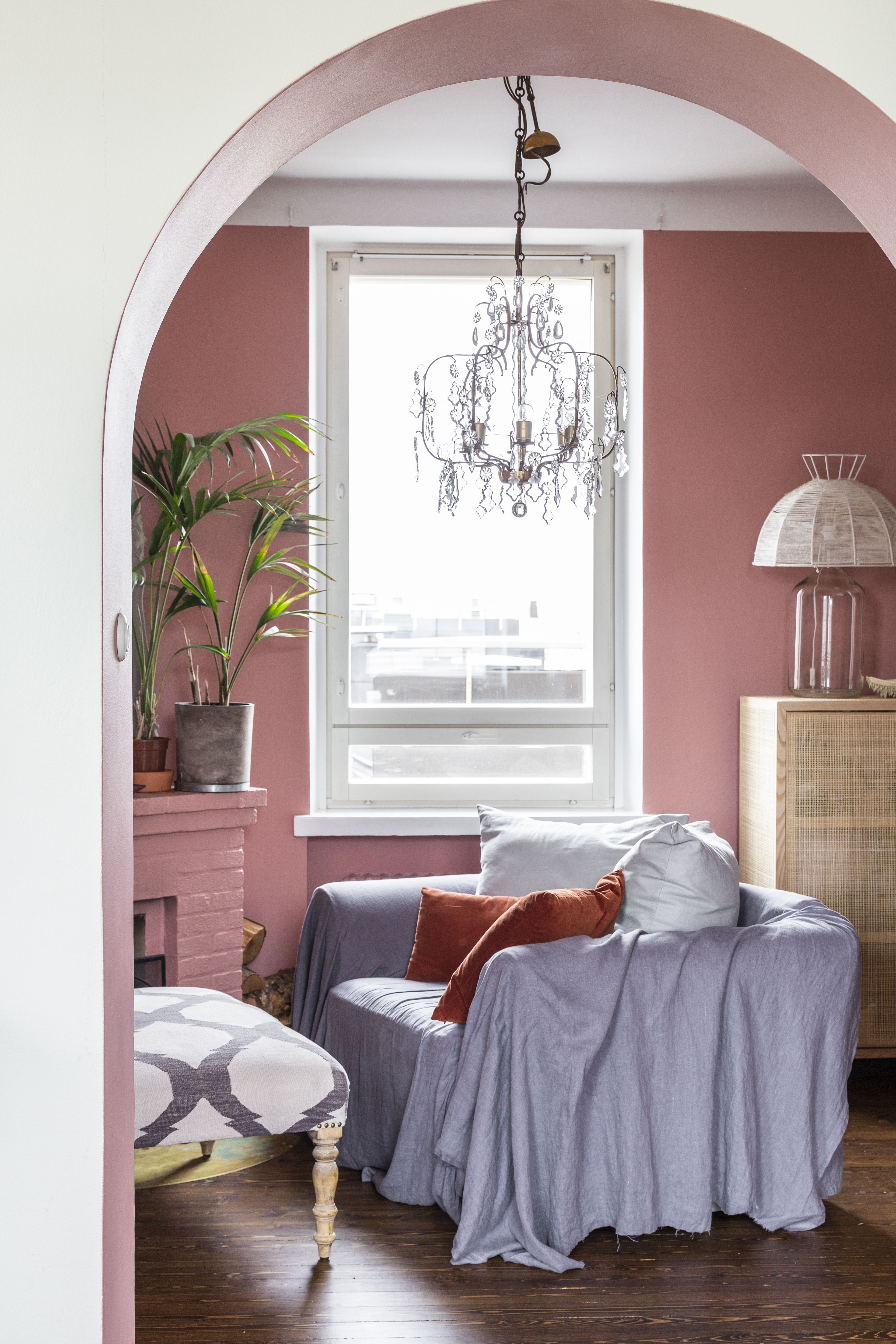 Värejä valitsen tunnelman ja valon mukaan. Takkahuoneesta tuli Lissabonin talomme värinen murrettu pinkki. Raaputtelin sieltä pienen palan laastia, jonka mätsäsin Tikkurilan maaleihin. Portugalissa värejä yhdistellään rohkeasti ja kauniisti. Tämä näkyy hyvin Lissabonin katukuvassa - talot loistavat monivärisinä, mutta kokonaisuus on harmoninen ja kaunis. Rohkea värinkäyttö näkyy siellä myös pukeutumisessa, ja aina pidempään Portugalissa oltuani pöllähdänkin takaisin Helsingin tummanpuhuvaan katukuvaan täydellisen sopimattomissa asuissa.