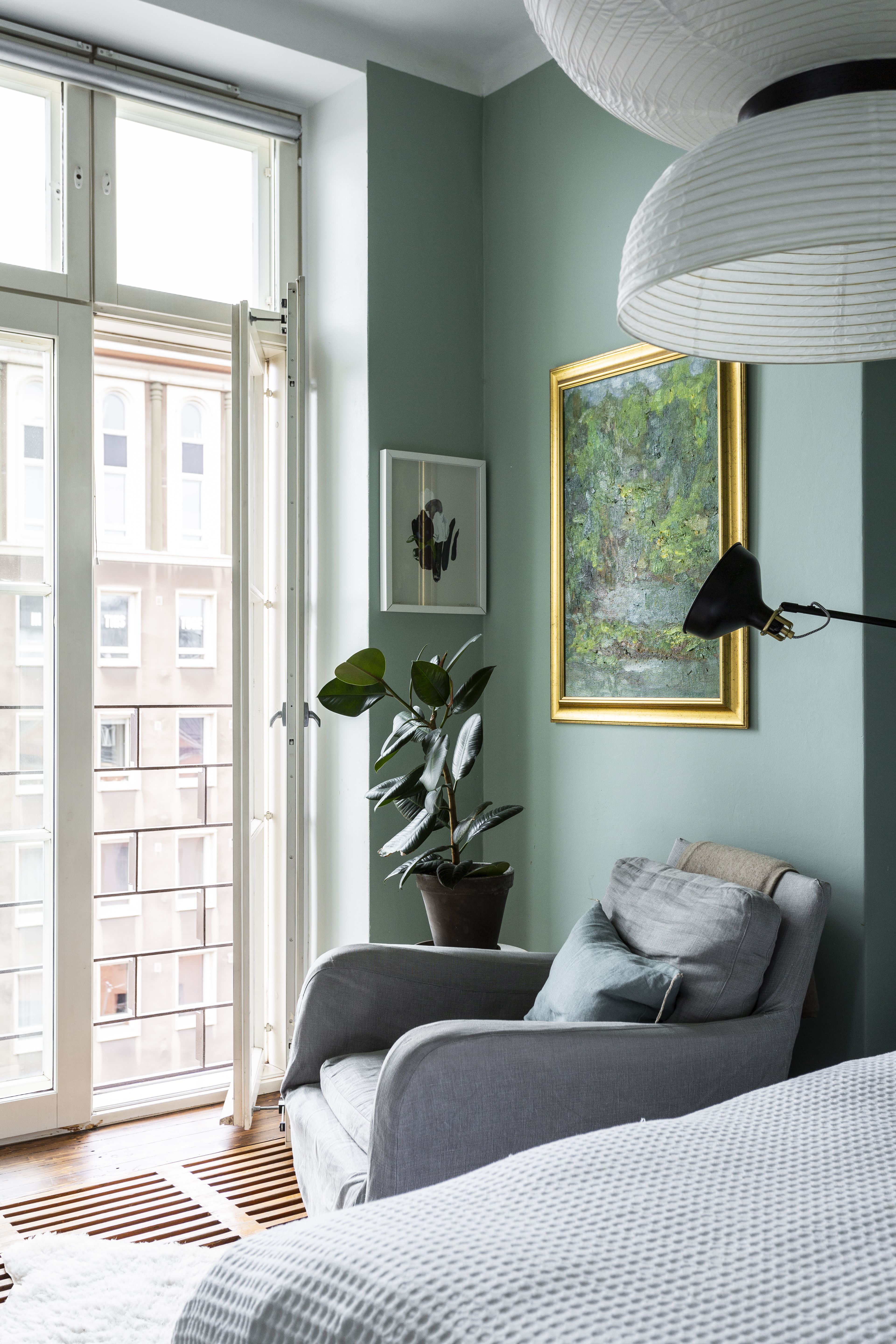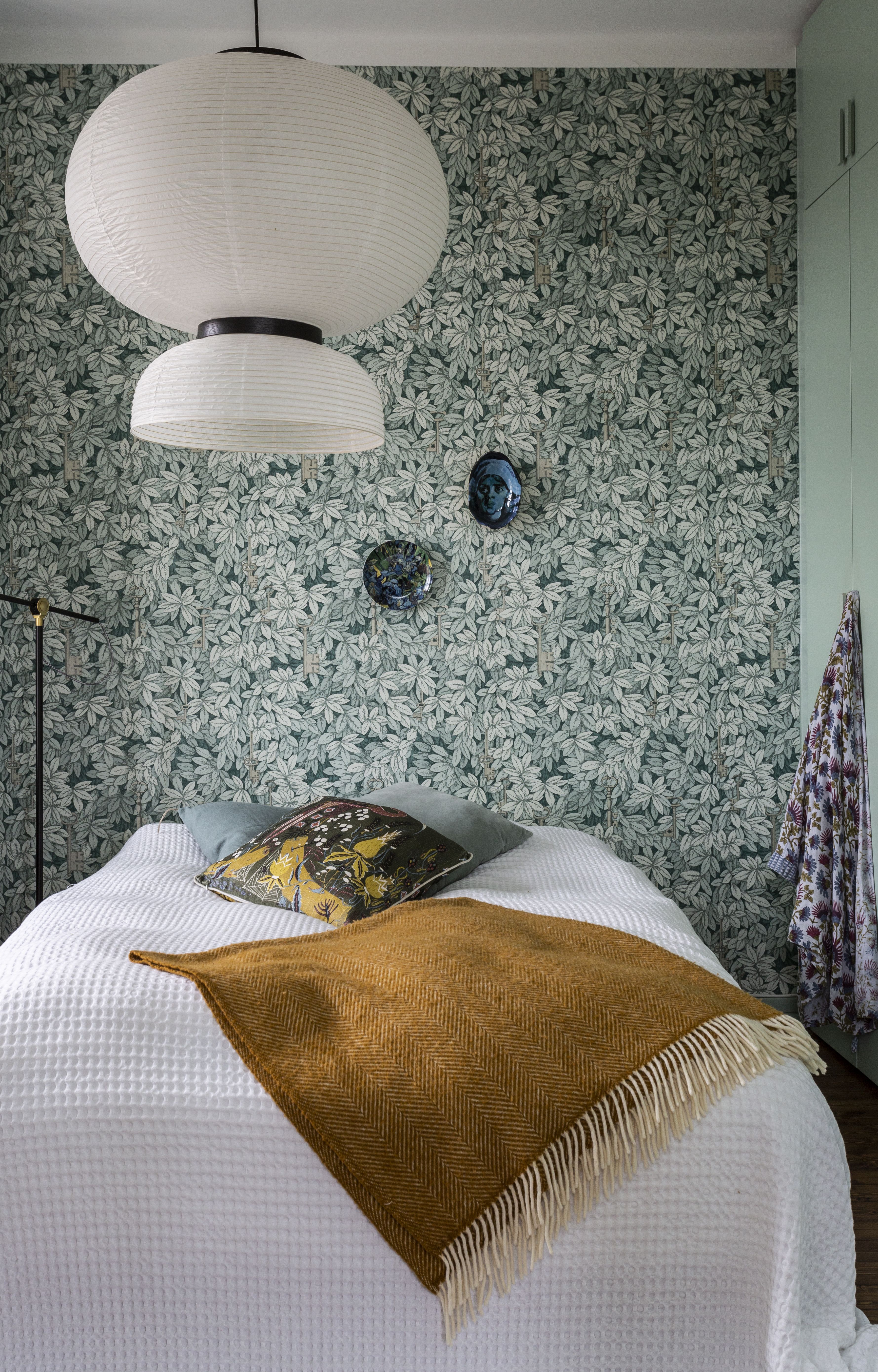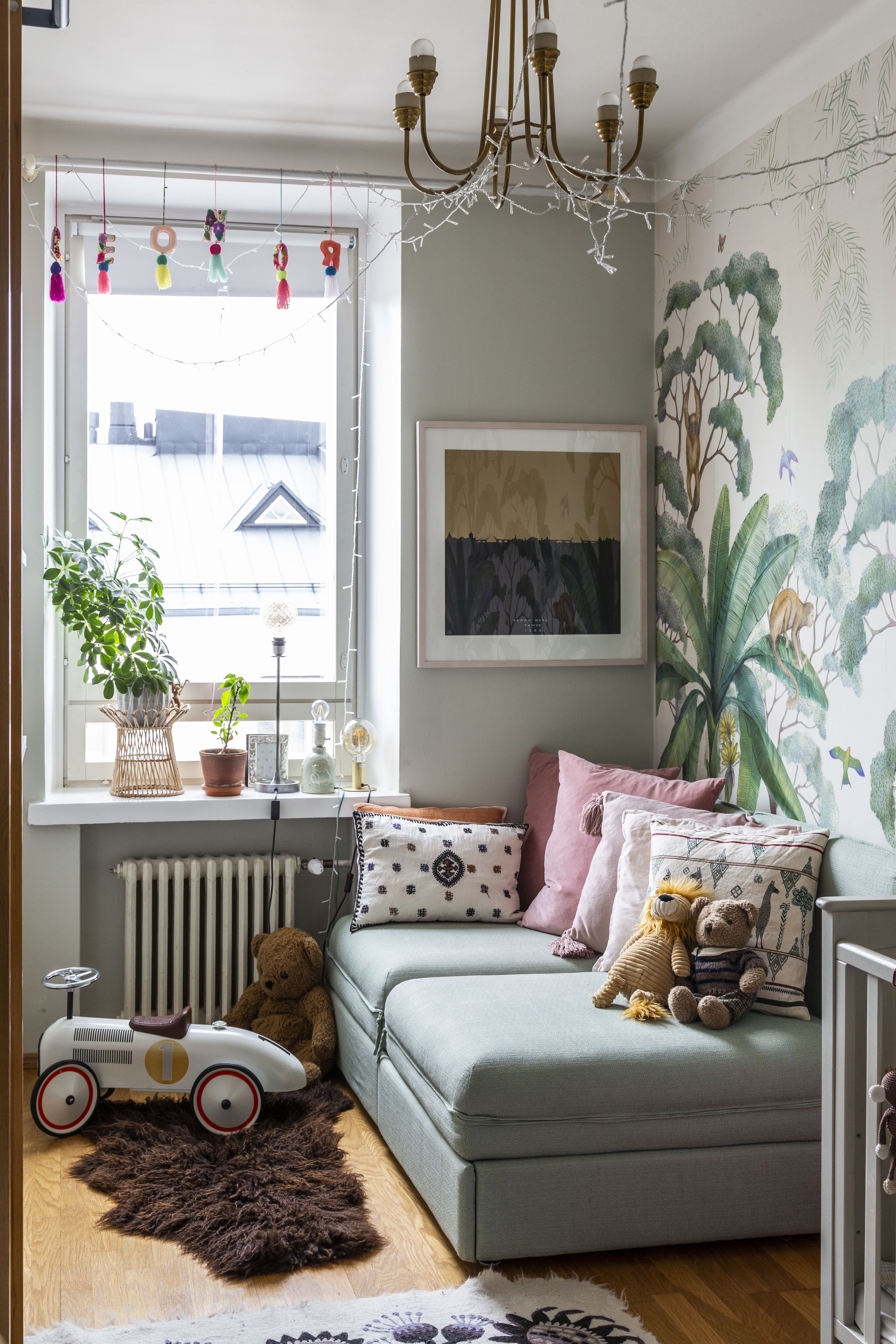 Koska asumme niin urbaanissa ympäristössä, halusimme tuoda asuntoon kasvien, värien ja tapettien myötä urbaanin kasvihuoneen tunnelmaa. Toisessa kotikaupungissamme Lissabonissa asumme keskustassa mieheni suvun korttelissa, jossa meillä on käytössämme vanha ja hassu portinvartijan talo. Korttelin keskellä on rehevä puutarha, jossa tyttäremme Leonor voi juoksennella serkkujensa kanssa vapaasti palmujen, viikunapuiden ja sitruunapuiden keskellä. Runsaat viherkasvit muistuttavat meitä elämästämme siellä pimeimpinäkin marraskuisina päivinä.