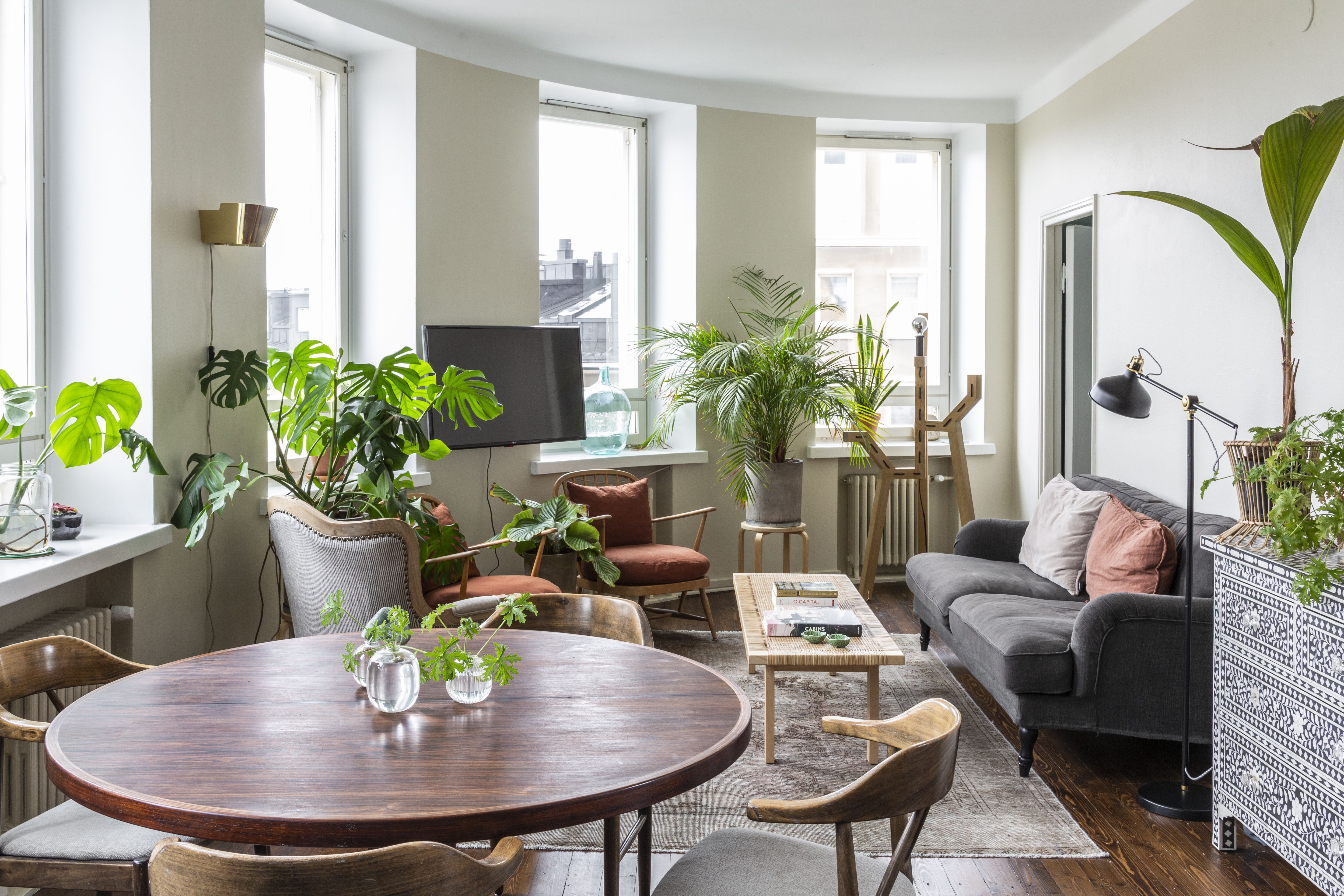 Tilavan olohuoneen puolikaaren muoto ja yhdeksän ikkunaa kaupungin ylle tekivät vaikutuksen heti ensi näkemältä. Asunnossamme on ikkunoita kolmeen ilmansuuntaan ja se kylpee valossa aamusta iltaan. Olimme innoissamme meneillään olevasta putkiremontista, koska sen ansiosta pääsimme vaikuttamaan vielä asunnon materiaaleihin. Etsimme tilaa, jossa olisi luonnetta ja tunnelmaa, ja tämä erikoisen muotoinen asunto aivan kaupungin keskellä oli meille täydellinen. Asumme nyt lähellä kaikkea, ja ystävät sekä vanhempani pistäytyvät usein, koska Kamppi sijaitsee kaikkien matkan varrella ja tänne pääsee helposti.