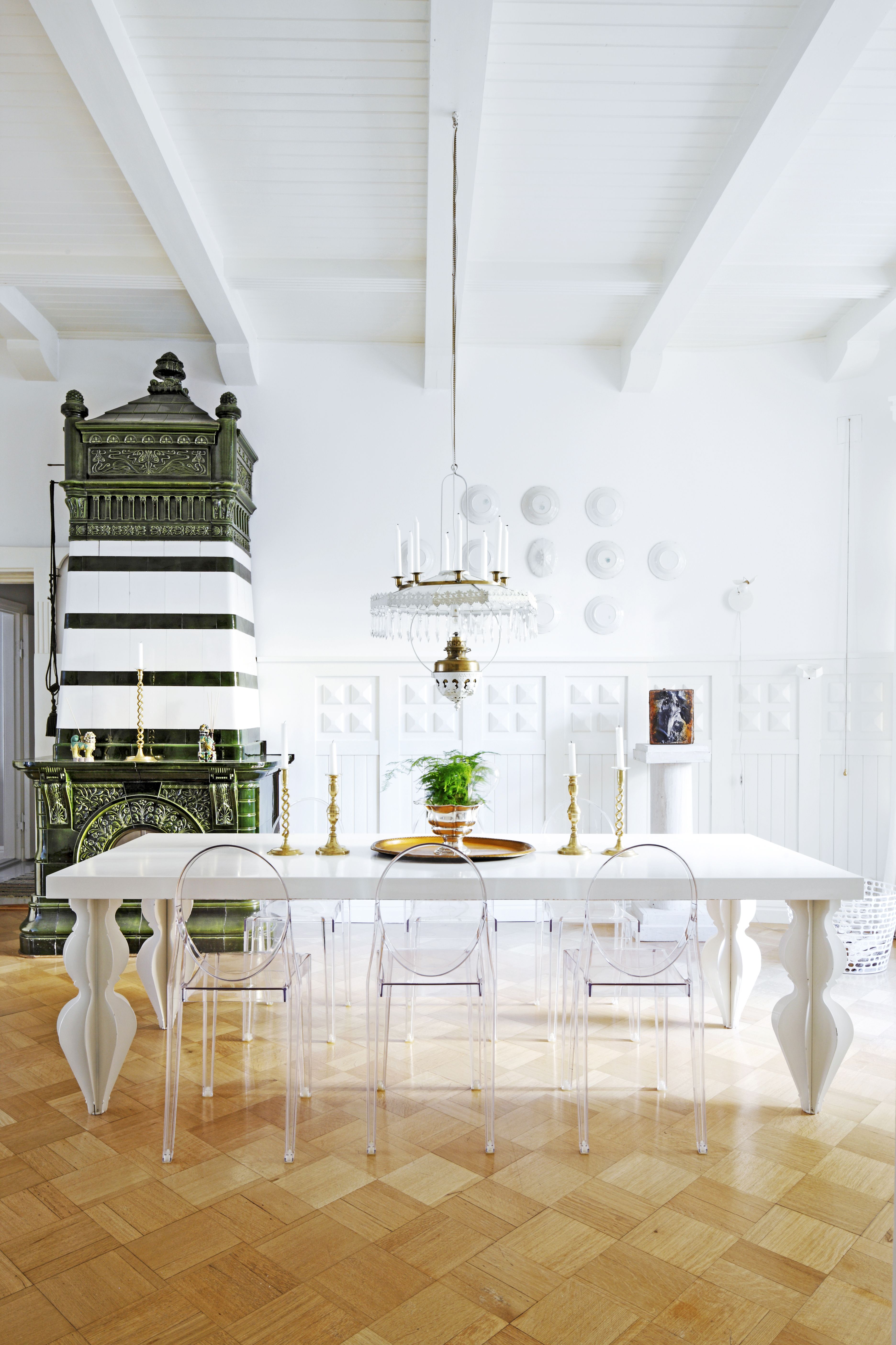Funktiosta hankittu ruokapöytä tuo klassiseen tilaan ripauksen huumoria ja kevyen modernin tunnelman. Erilaiset perintölautaset on kiinnitetty seinään kekseliäästi väärin päin herkäksi, valkeaksi kokonaisuudeksi. Vanhan kukkapylvään päällä on islantilaisen taiteilijan teos, jossa on käytetty röntgenkuvia. Ruokapöydän ympärillä on Kartellin Victoria Ghost -tuolit.