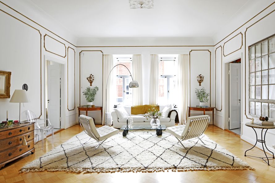 Vaalea kerrostaloasunto helsinkiläisessä jugendtalossa on remontoitu vanhaa kunnioittaen ja vaaleaksi. Olohuoneen paneelit koristeltiin pronssin sävyllä ja seinät niiden ympäriltä maalattiin valkoiseksi. Alkuperäiselle lattialle ei tehty mitään, jottei asuntoa olisi remontissa siivottu hengettömäksi. Sohvapöytä on Zarrosta. Arco-valaisin on Achille ja Pierre Castiglionin suunnittelema. Olohuoneen suuri matto on teetetty tilaustyönä Marokossa. Seinällä on vanha ikkuna, johon on kiinnitetty Outi Heiskasen piirroksia. Valkoiset Barcelona-tuolit ovat Ludwig Mies van der Rohen vuonna 1929 suunnittelemat klassikot.