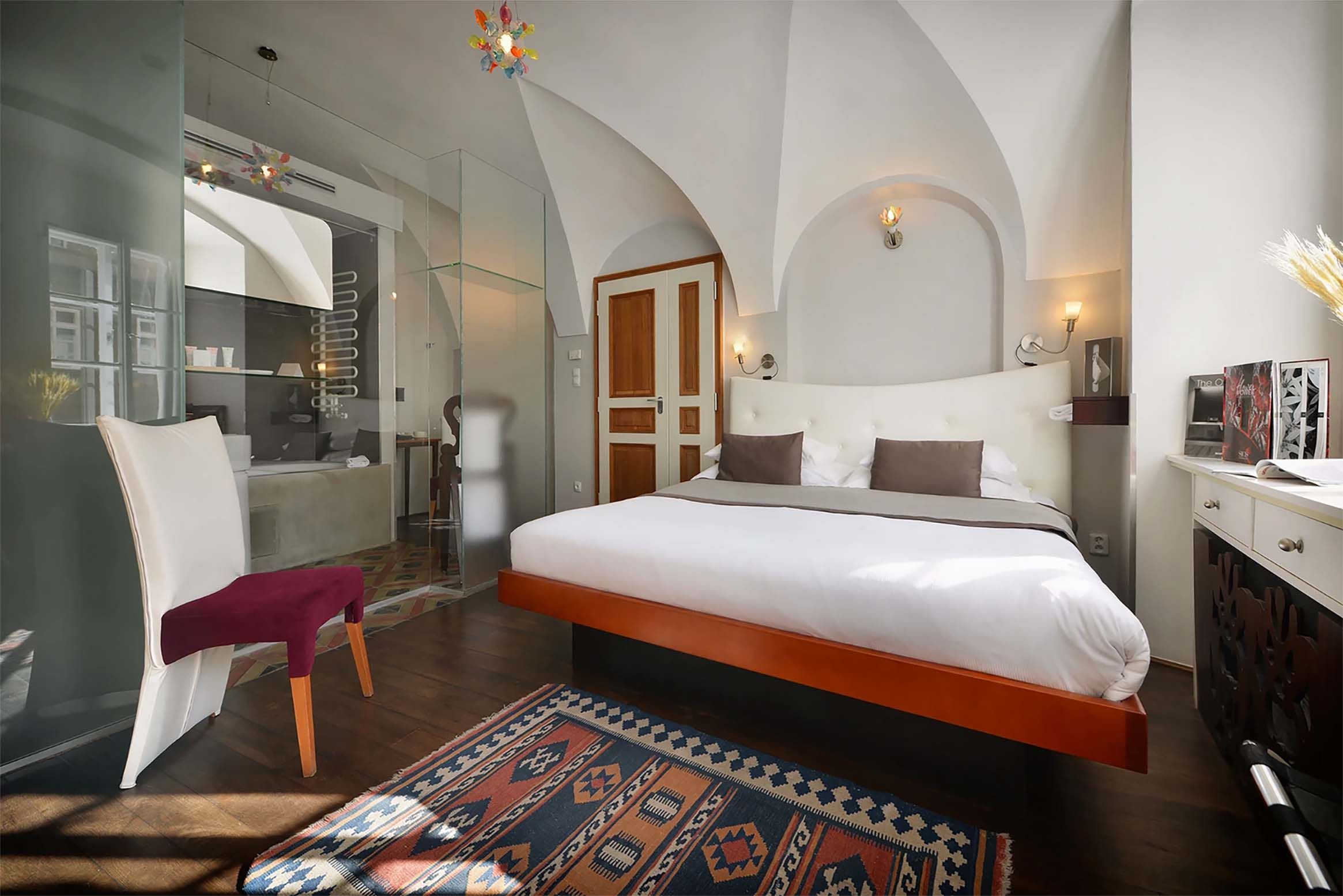 Arkkitehti Eva Jiicná, 86, on yhä kuuma nimi Prahassa. Lontooseen hän on suunnitellut Kenzon myymälän ja vakuutusyhtiö Lloyd'sin pääkonttorin, Tokioon Hugo Boss -liikkeen sisustuksen. Kymmenen vuotta sitten avautui Hotel Josef, jota sanotaan Evan rakennustaiteelliseksi lapseksi. Jo julkisivun ikkunat säväyttävät. Hotellissa Evan lempimateriaalit, lasi ja teräs, tuovat särmää vanhaankaupunkiin. Vilvoittele kesällä hotellin pihan ihanassa puutarhabaarissa. Sisällä anna katseen vaeltaa hypnoottisen kutsuvassa kierreportaikossa.