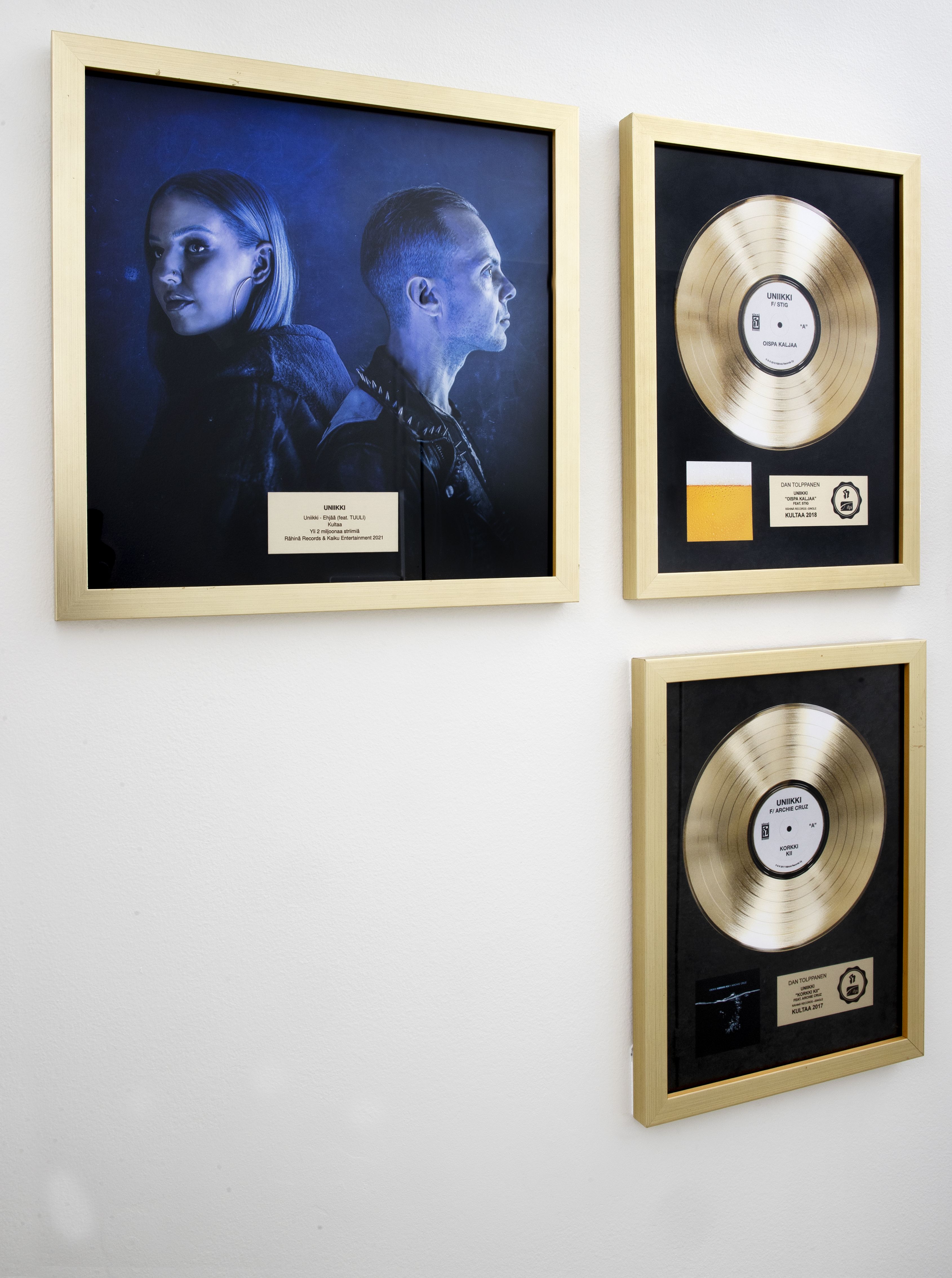 Saamani kultalevyt eivät ole aiemmin olleet kodeissani esillä. Ei ole ollut sopivaa paikkaa, enkä oikein ole tohtinut laittaa niitä seinälle - mietin, onko se liikaa. Puolisoni kuitenkin rohkaisi, että miksei: voihan tehdystä työstä saaduista palkinnoista nauttia ja iloita. Pitkän ja kapean eteiskäytävän seinä valikoitui ripustuspaikaksi, ja siihen ne itse asiassa sopivat ihan mainiosti. Kenkiä sitoessa on hauska välillä muistella, mitä kaikkea on tullut duunattua vuosien varrella. Ja toki toivon, että kultalevyjä tulisi joskus vielä lisää.