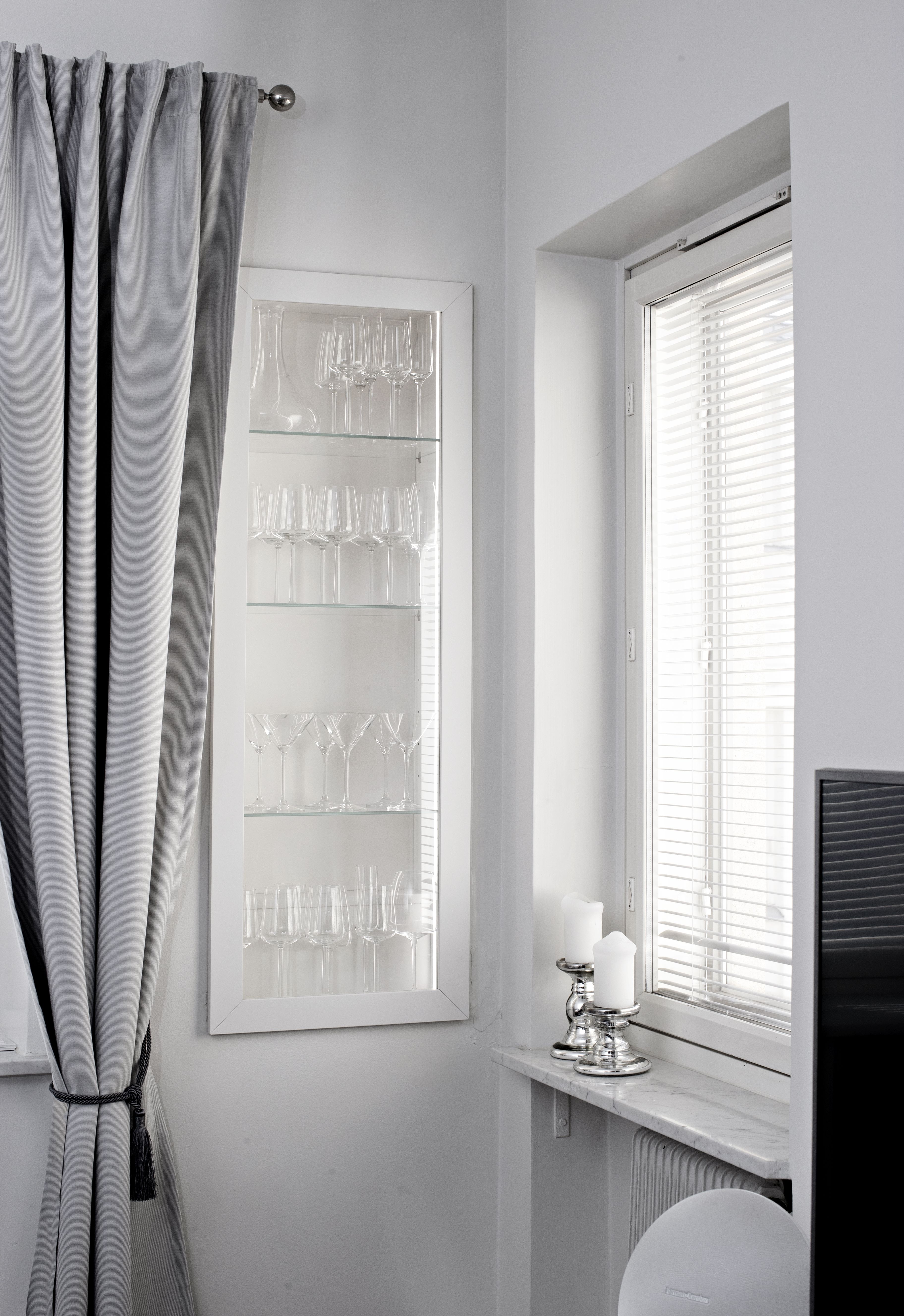 Saman puusepän tekemissä vaatekaapeissa ruokailutilan takaseinällä on tarpeellista säilytystilaa. Etenkin minulla on paljon vaatteita, vaikka muuttaessa luovuinkin paljosta tavarasta. Vaatteiden suhteen noudatan sääntöä: jos hankkii uutta, samassa suhteessa pitää myös myydä pois.