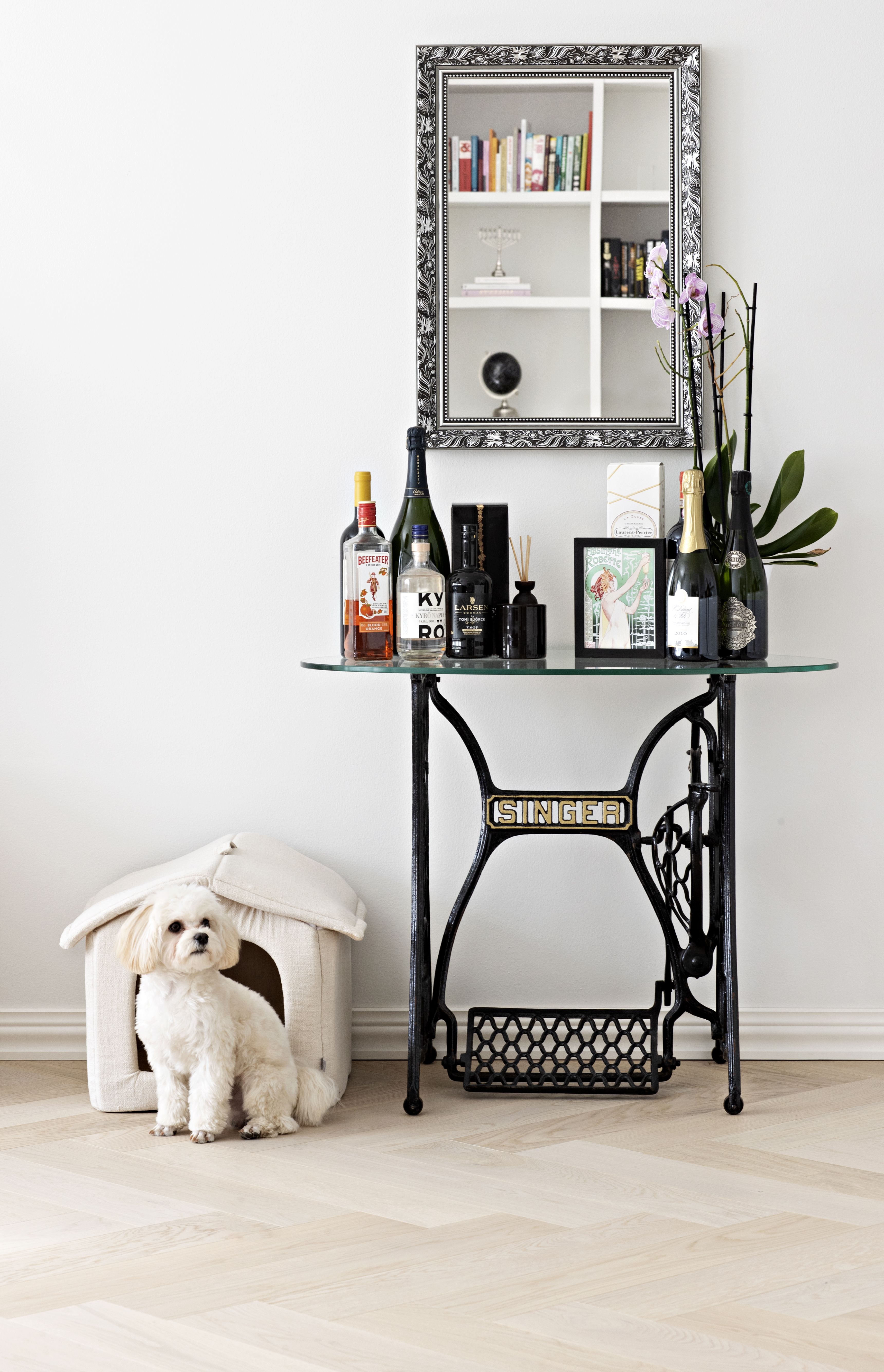 Toiveissamme oli hankkia uuteen kotiin joko tarjoiluvaunu tai baaripöytä, mutta kaupoista etsimällä ei löytynyt mielestä. Sitten saimme idean edellisen kotini kylpyhuoneesta, jossa lavuaari oli asennettu vanhojen Singerin ompelukoneen jalkojen päälle. Bongasin samanlaiset jalat Torista, ja päälle hankittiin Lasitehtaan ovaalinmuotoinen lasitaso.