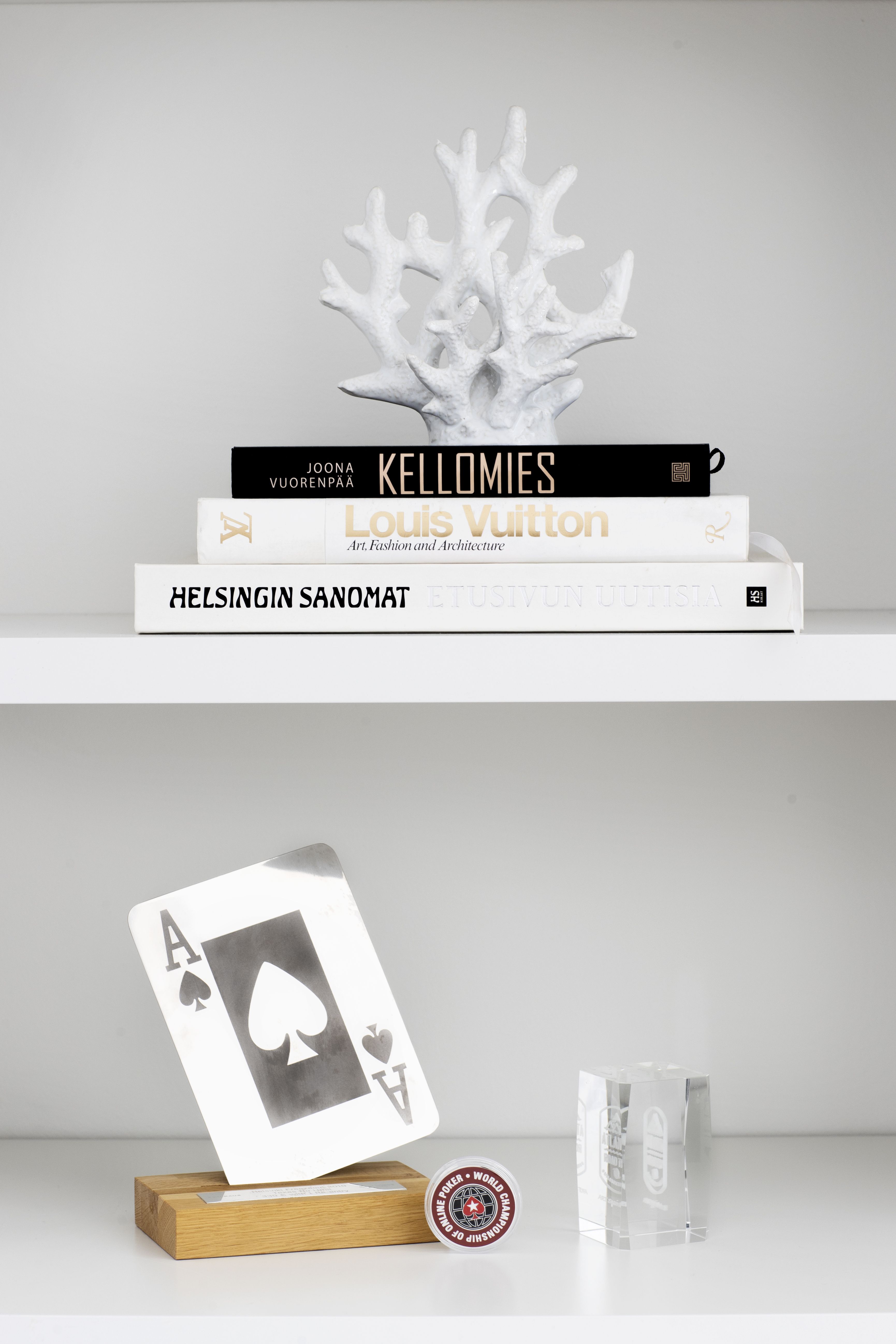 Perheessäni on aina luettu paljon. Äitini on kirjastonhoitaja ja isäni kirjakeräilijä, joten lapsuudenkotini on kirjoja tupaten täynnä. Edellisessä asunnossani ei ollut kirjahyllyä lainkaan, täällä oli pakko korjata tilanne. Puuseppä Topias Räty teki meille kiinteän version. Olen lopputulokseen todella tyytyväinen, hylly on hienoin yksittäinen huonekalumme. Nyt on tilaa pikku hiljaa haalia lisää kirjoja hyllyihin.